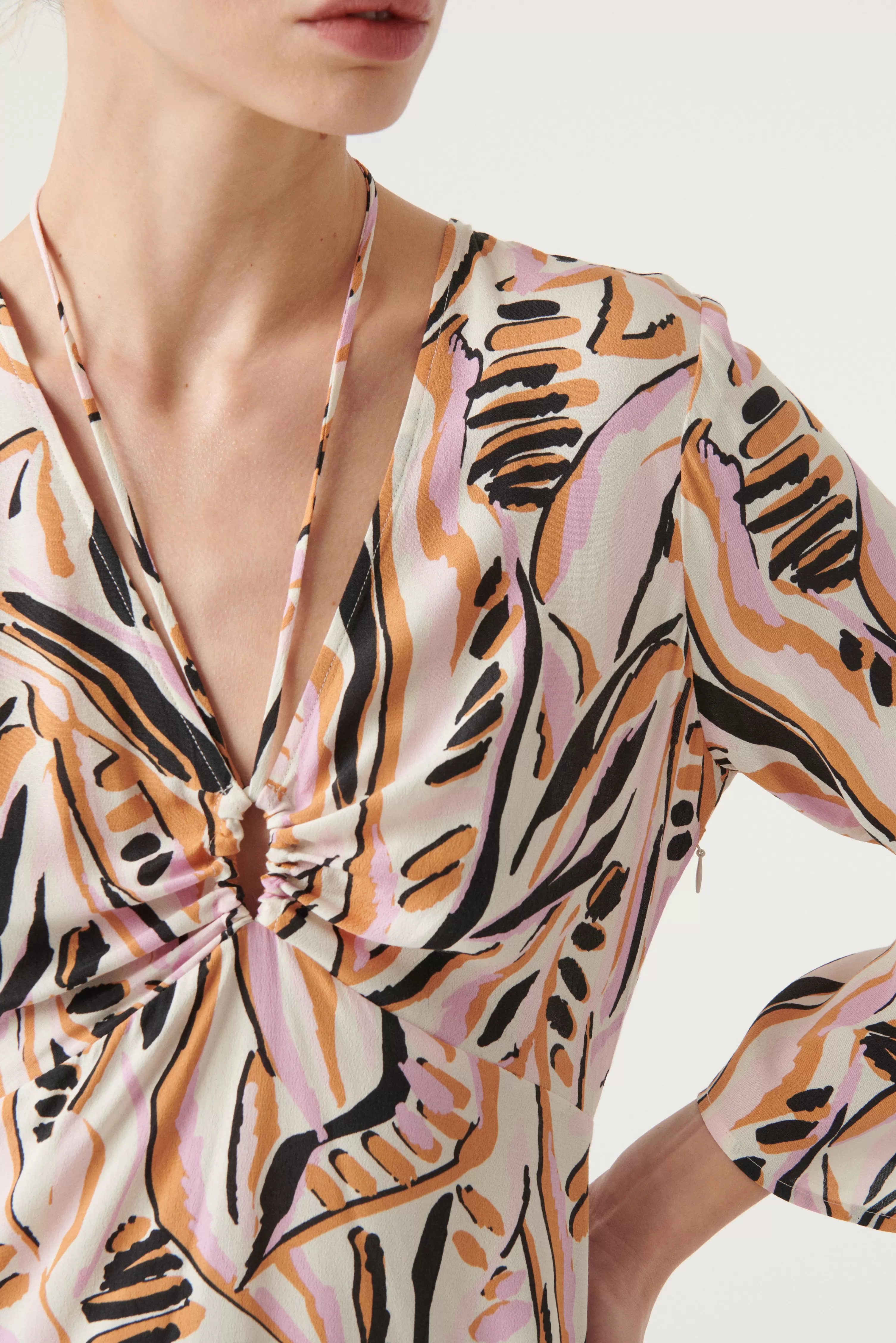 “De Jurk Thesee Is Een Wonder, Kort En Vloeiend. In Viscose Is Het Als Een Streling Op De Huid, Een Genot Om Te Dragen! Licht Uitlopende, Lange Mouwen, De Uitsparing Op De Borst Is Om Voor Te Sterven! De Schuifschakel Ter Hoogte Van De Borst Kan Aan Beide Zijden Worden Gesloten, Charmante Parels Sieren De Schakels Voor Een Vleugje Licht. Je Kunt Strikken Op De Borst Of In De Nek. 70’S Inspiratie, Wij Houden Van Pagodemouwen! Te Combineren Met Een Paar Suede Laarzen!