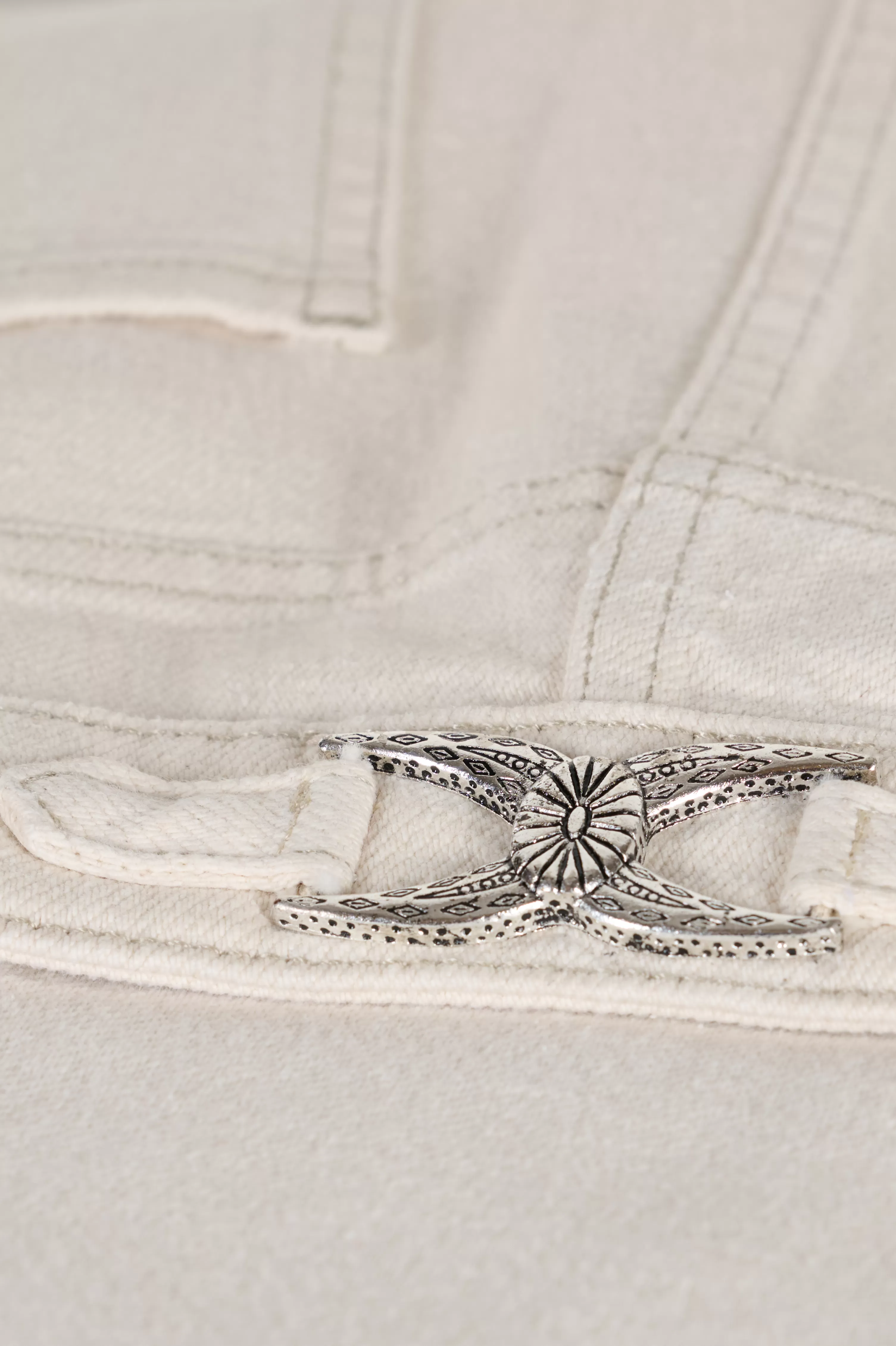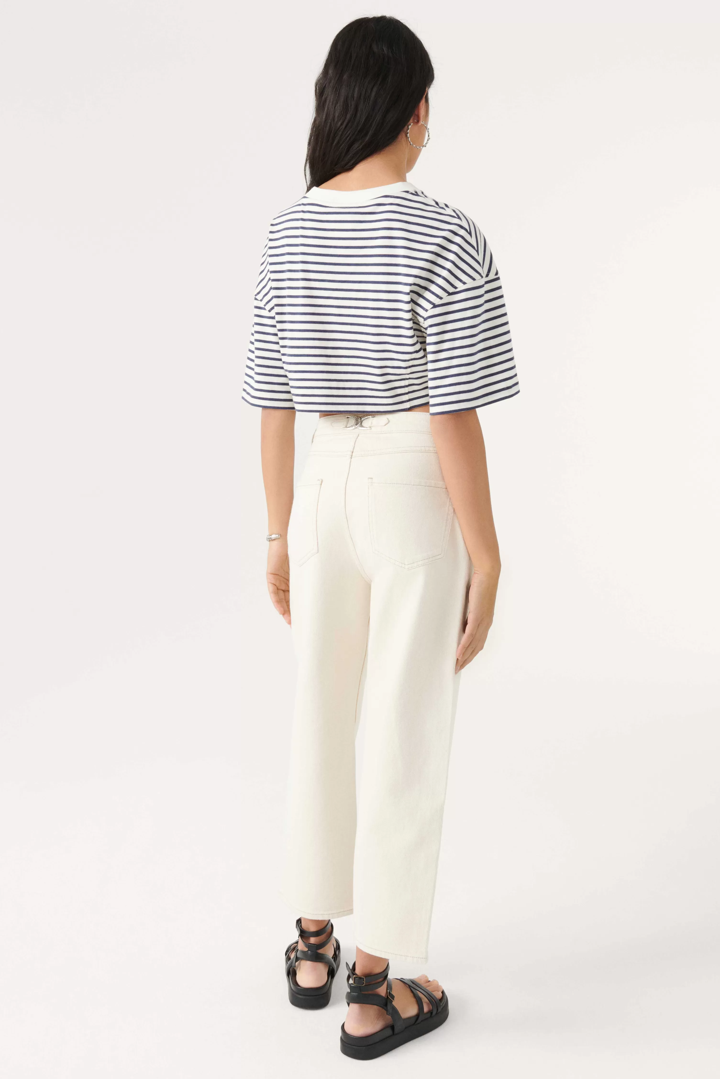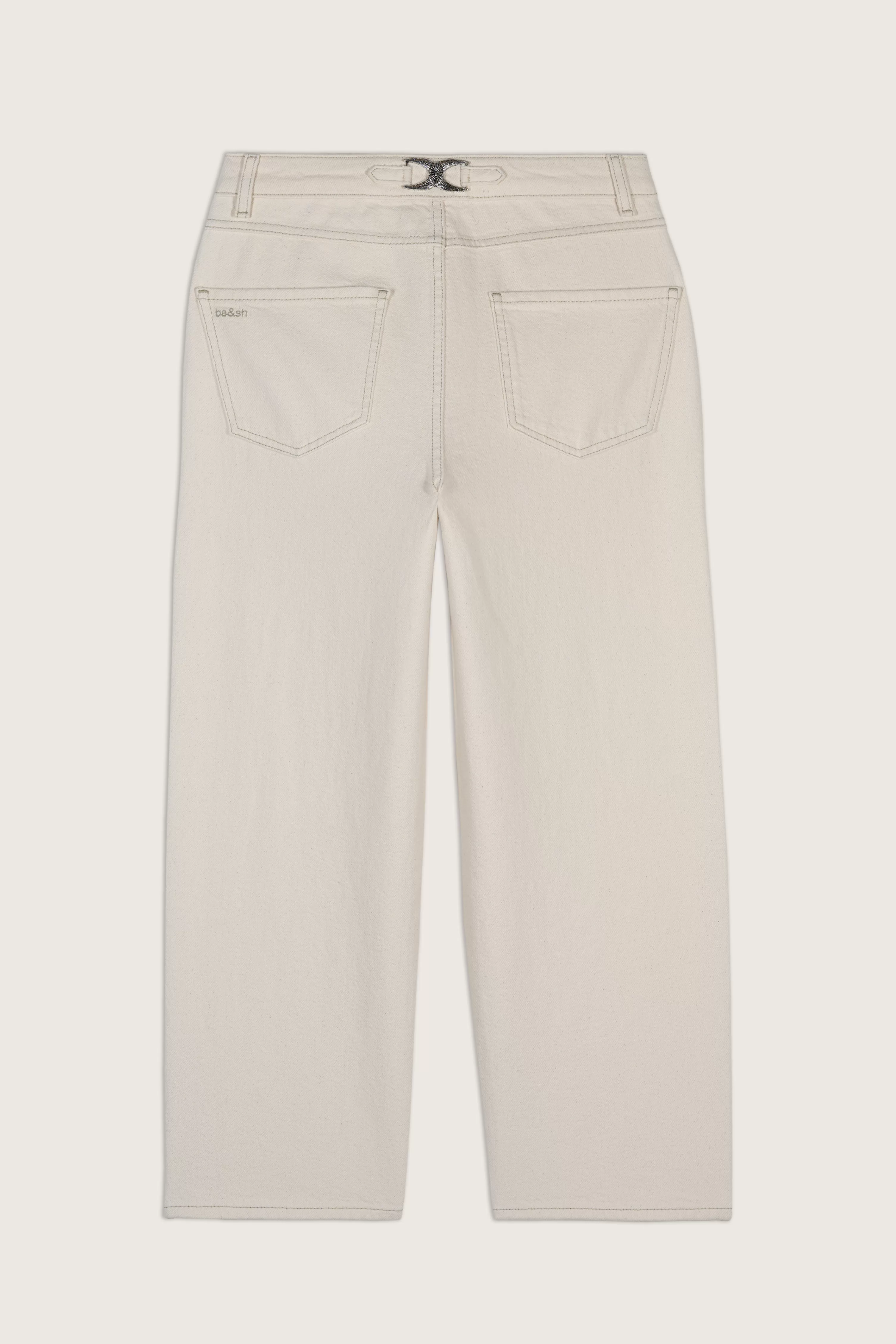 Aime Jeans Zijn Een Musthave In Onze Zomergarderobe! Het Is Gemaakt Van Ecru Katoendenim En Heeft Een Zeven-Achtste Flare-Snit Die De Enkel Onthult En Een Hoge Taille Voor Een Slanke Look. De Achterzak Is Geborduurd Met Het Kenmerkende Logo Van Ba&Sh En De Riemlussen Zijn Versierd Met Een Bijkomend Detail: Een Zilveren Metalen Gesp Gegraveerd Met Westerse Inspiraties In Een Sieradengeest, Om Te Accentueren Door Het Te Combineren Met Een Crop-Top En Mooie Sandalen.