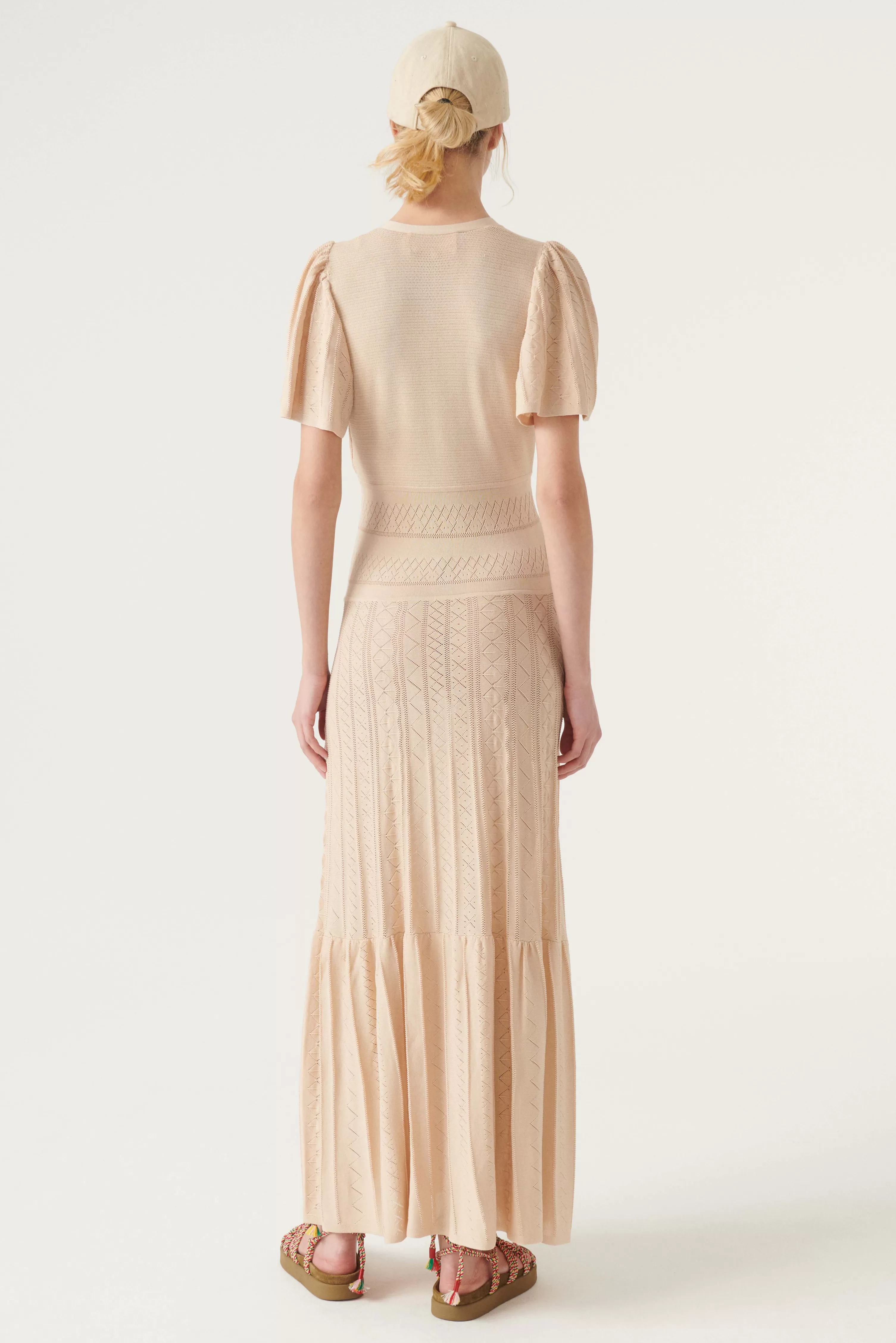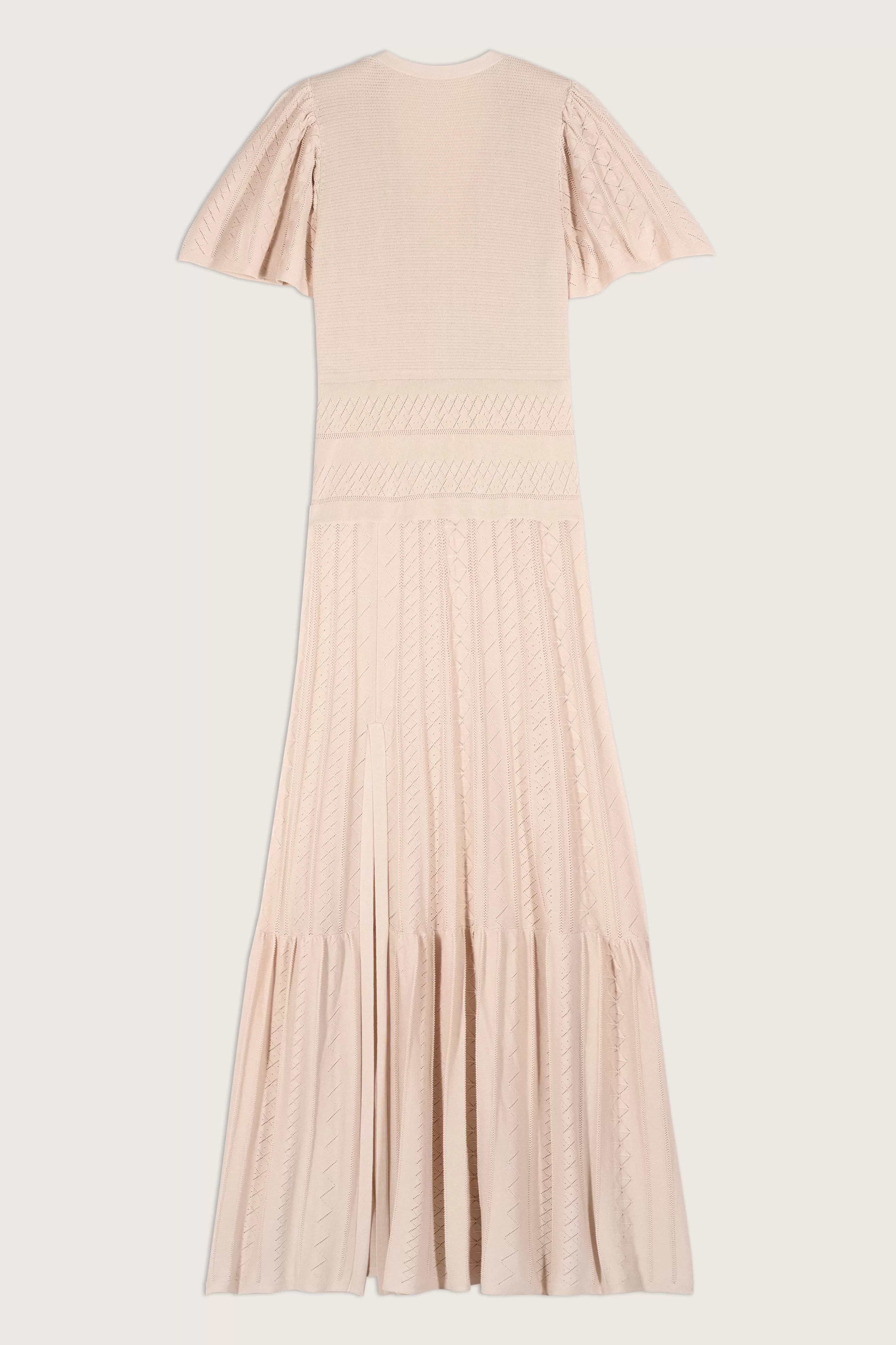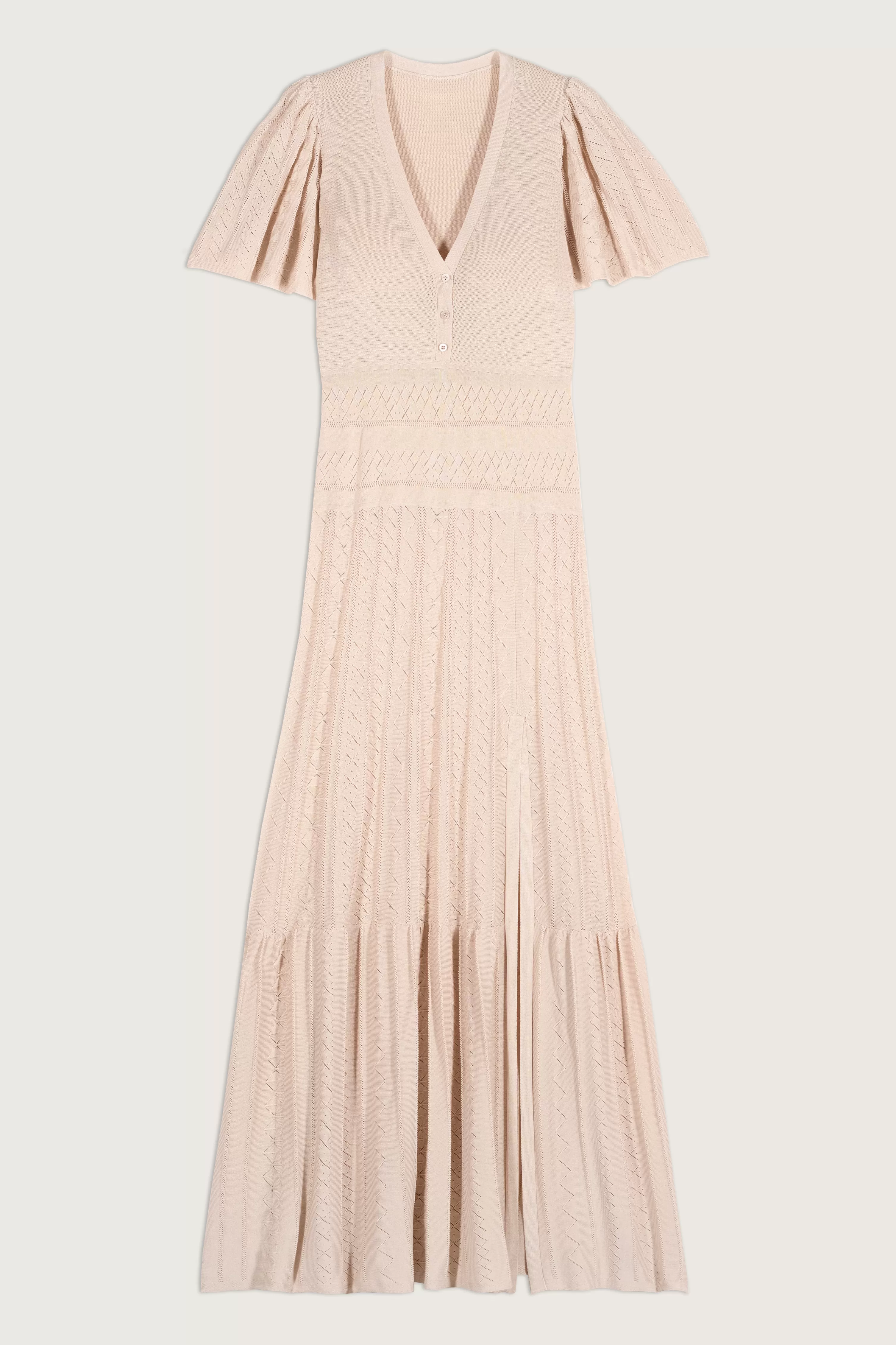 De Avana-Jurk Is Een Pointelle-Gebreid Model, Midi-Lengte, Zeer Elegant. Iconisch Model, Het Is Ultravloeiend Met Zijn Sublieme Mix Van Jersey En Breisels. De Halslijn Is Diep, Versierd Met Drie Knopen, Het Is Ontworpen Om Alle Lichaamstypes Te Accentueren! De Mouwen In Vlinderstijl, De Split Aan De Voorkant, We Houden Van Elk Detail Van Dit Ongelooflijke Model. Draag Met Sandalen Of Hoge Hakken Voor Een Onvergetelijke Stijl!
