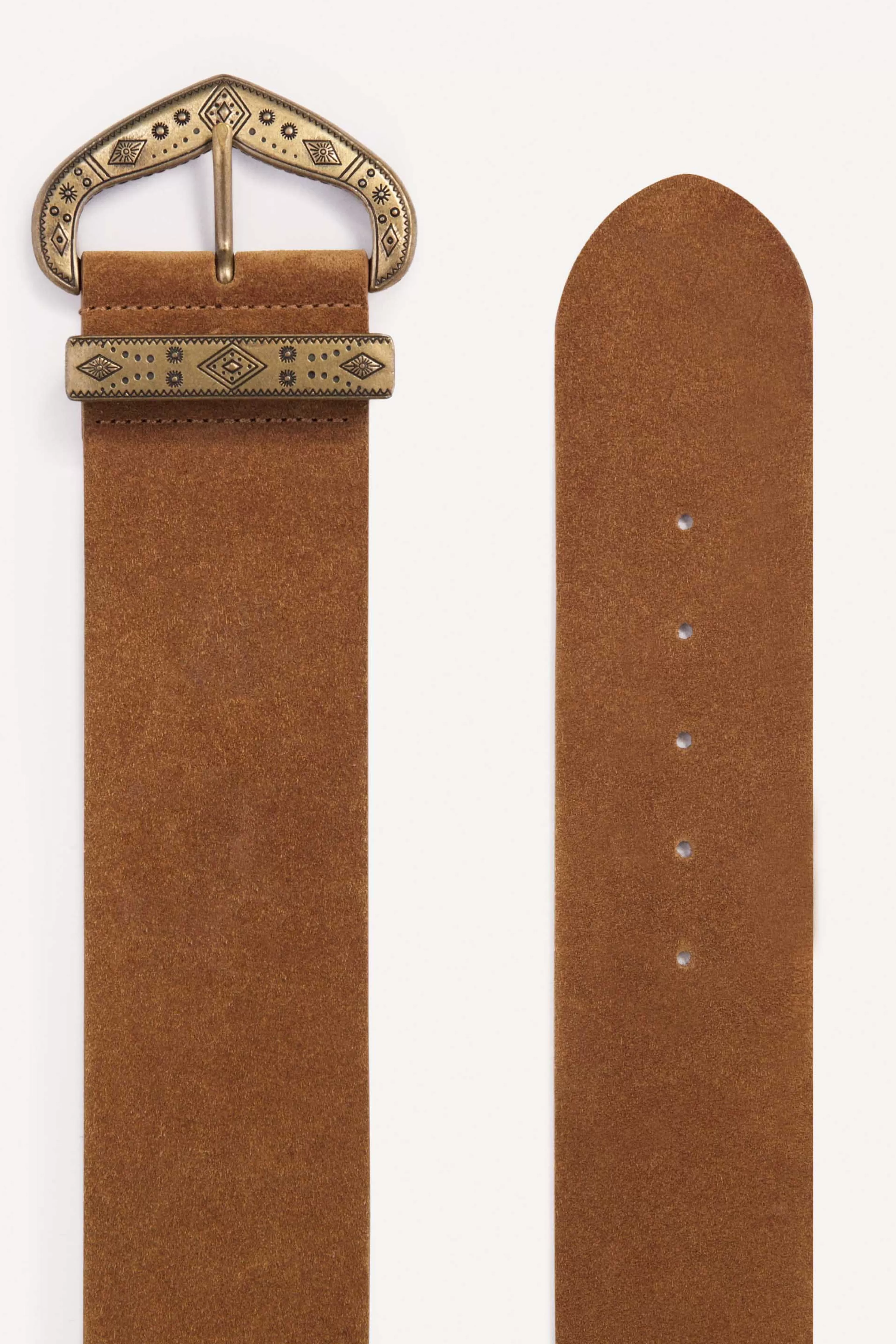 Met Zijn Zeer Chique Suede-Effect Trekt De Bikcha-Riem Alle Aandacht. Dit Modeaccessoire, Geplaatst Op De Heupen Of De Taille, Bevestigt Een Natuurlijke Western-Geinspireerde Look. De Kenmerkende Gesp Heeft Etnische Details In Een Metallic Tint. Een Ster Van Rustieke Looks, Deze Brede Riem Van Splitleer Geeft Ook Een Meer Klassieke Outfit Bestaande Uit Een Broek En Een Blazer.