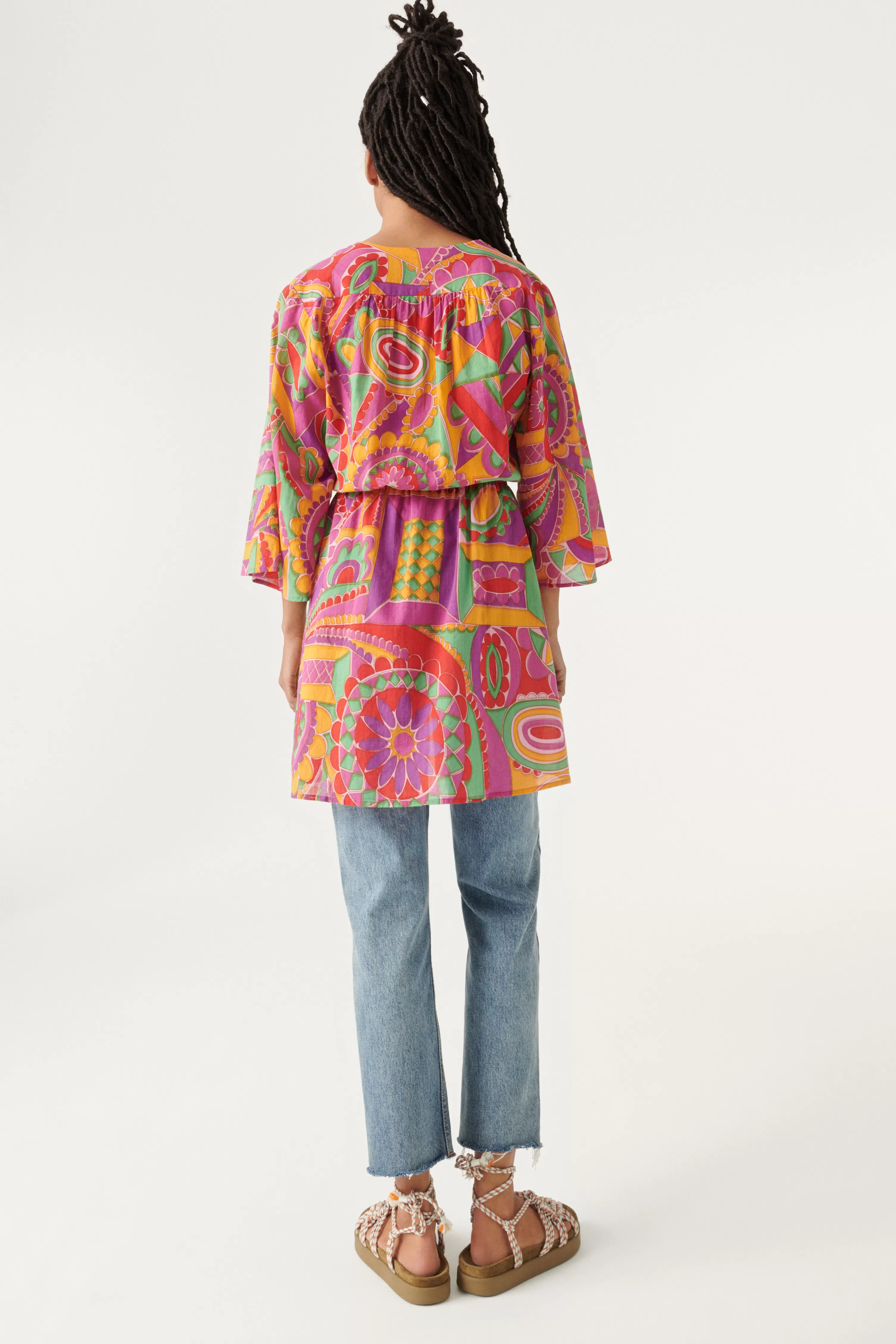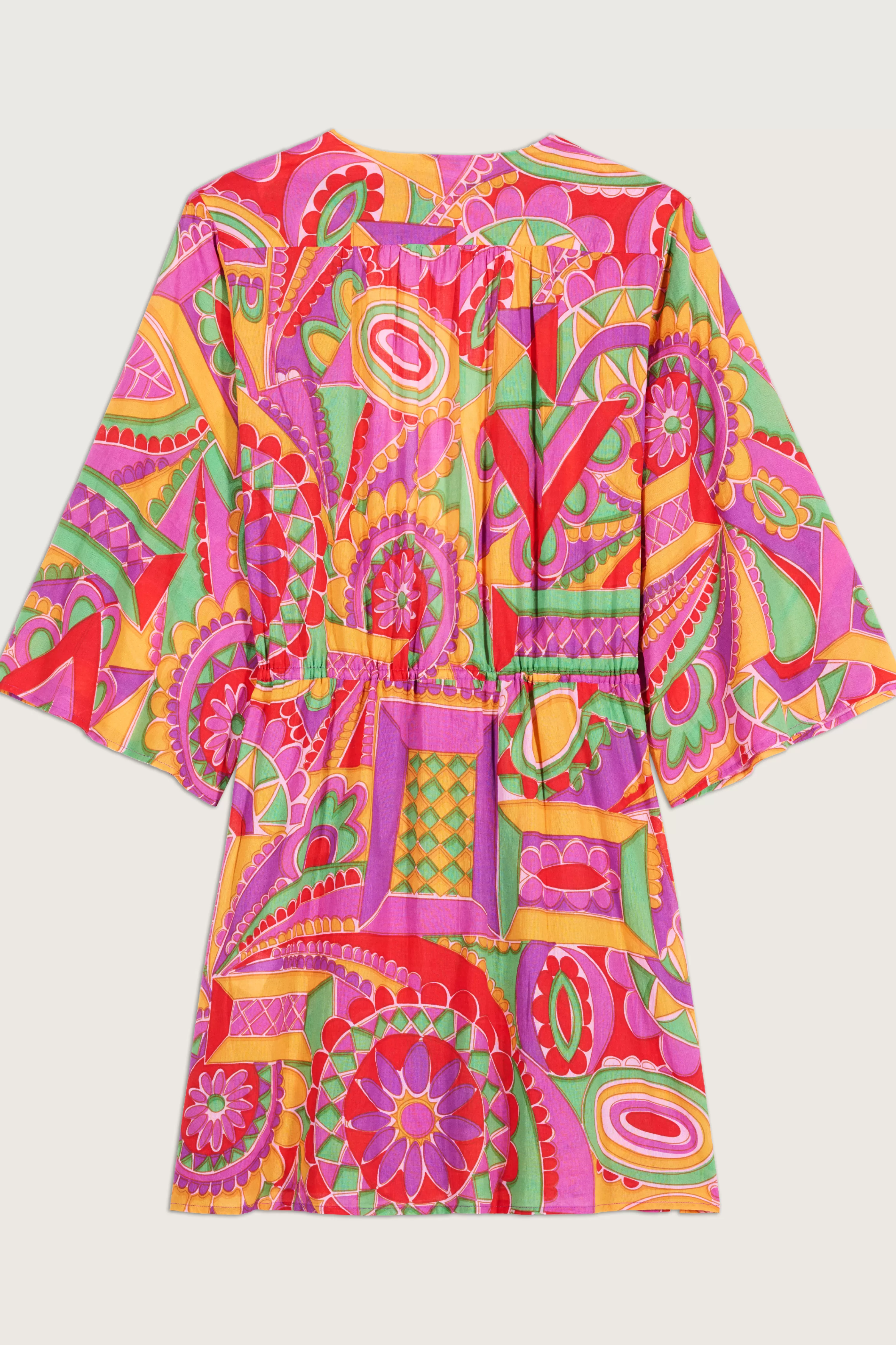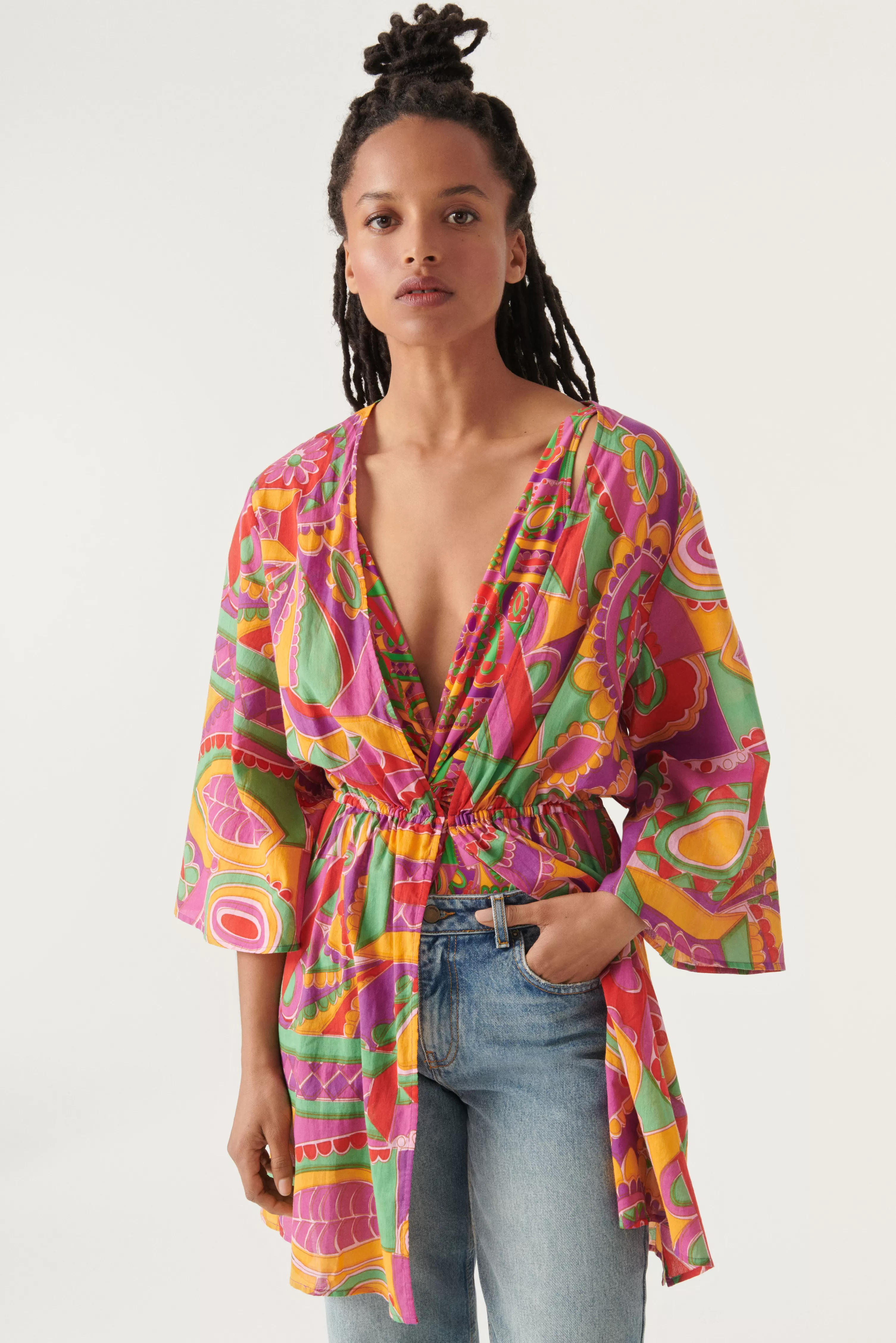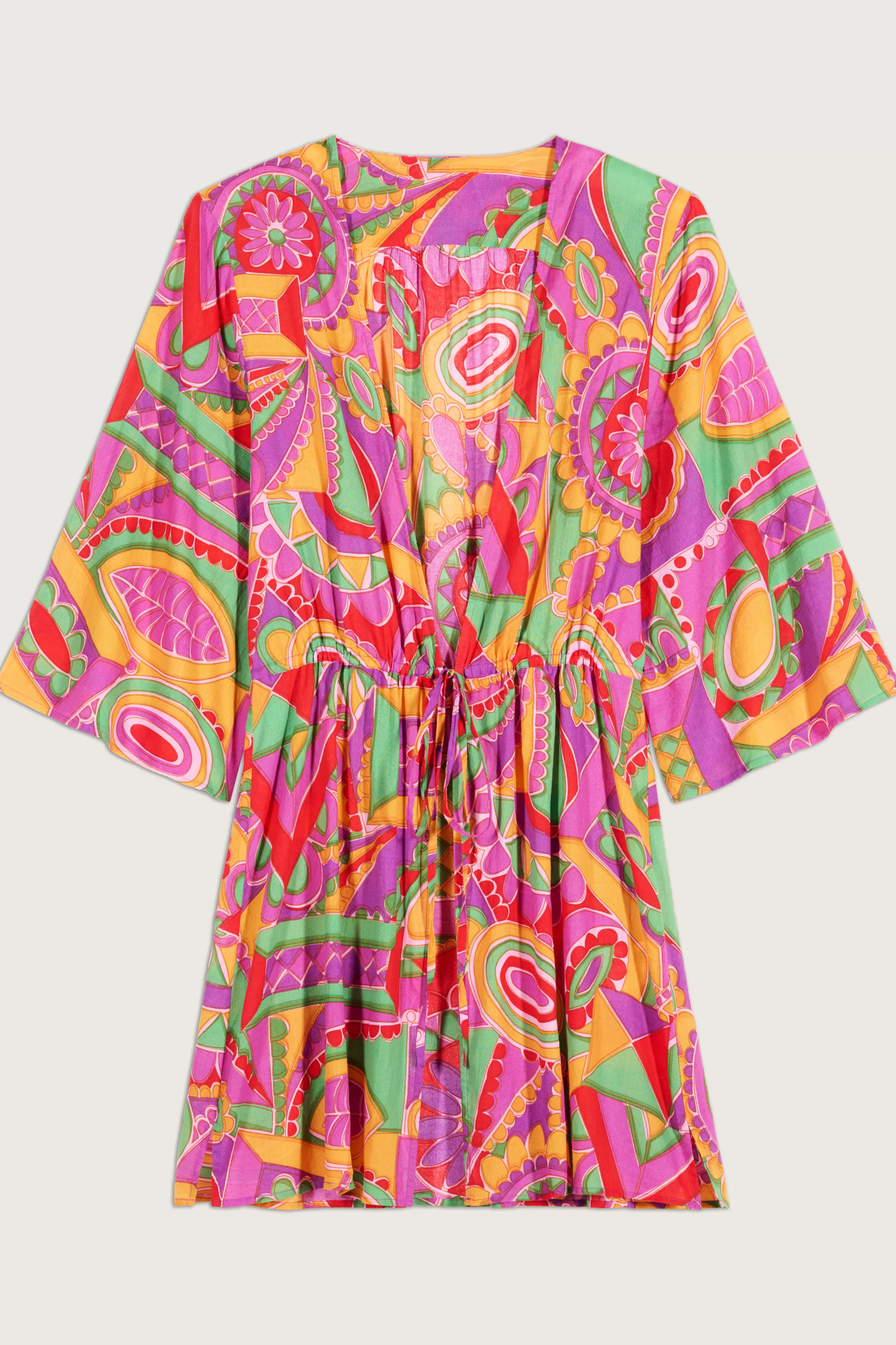 De Dean Kimono Is Een Licht Model, Zeer Aangenaam Op De Huid En Zal Deze Zomer Snel Je Beste Vriend Worden. In Katoen, Het Is Erg Kleurrijk, Inspiratie Uit De Jaren 70, Rio En Brazilie. Van Al Deze Kleuren Krijg Je Meteen Een Goed Humeur! Het Is Heel Gemakkelijk Te Combineren En We Zien Het Graag In De Wind Op Het Strand Vliegen! Te Combineren Met Je Badpak, Korte Broek En Tanktop En Waarom Geen Grote Hoed!