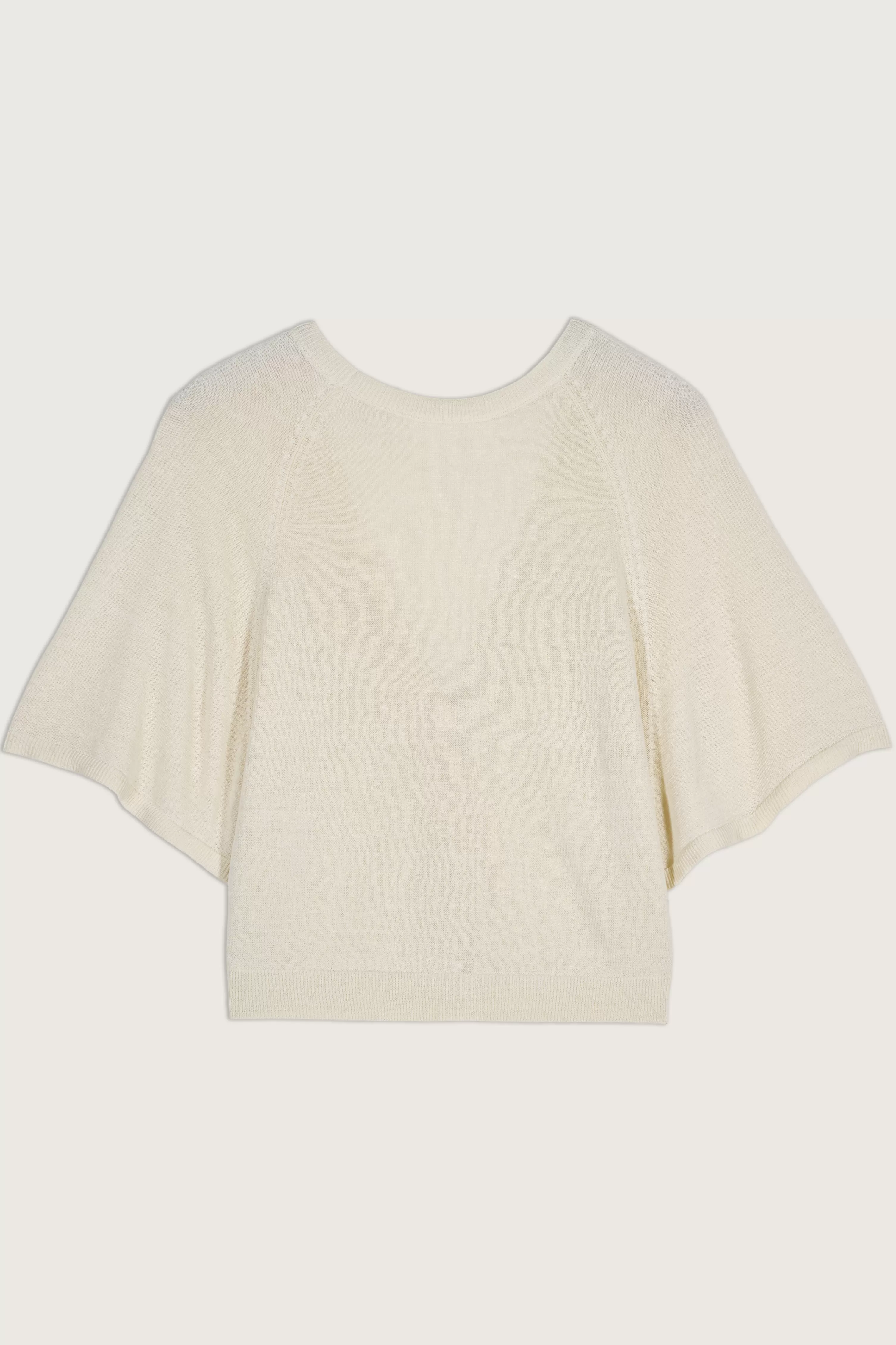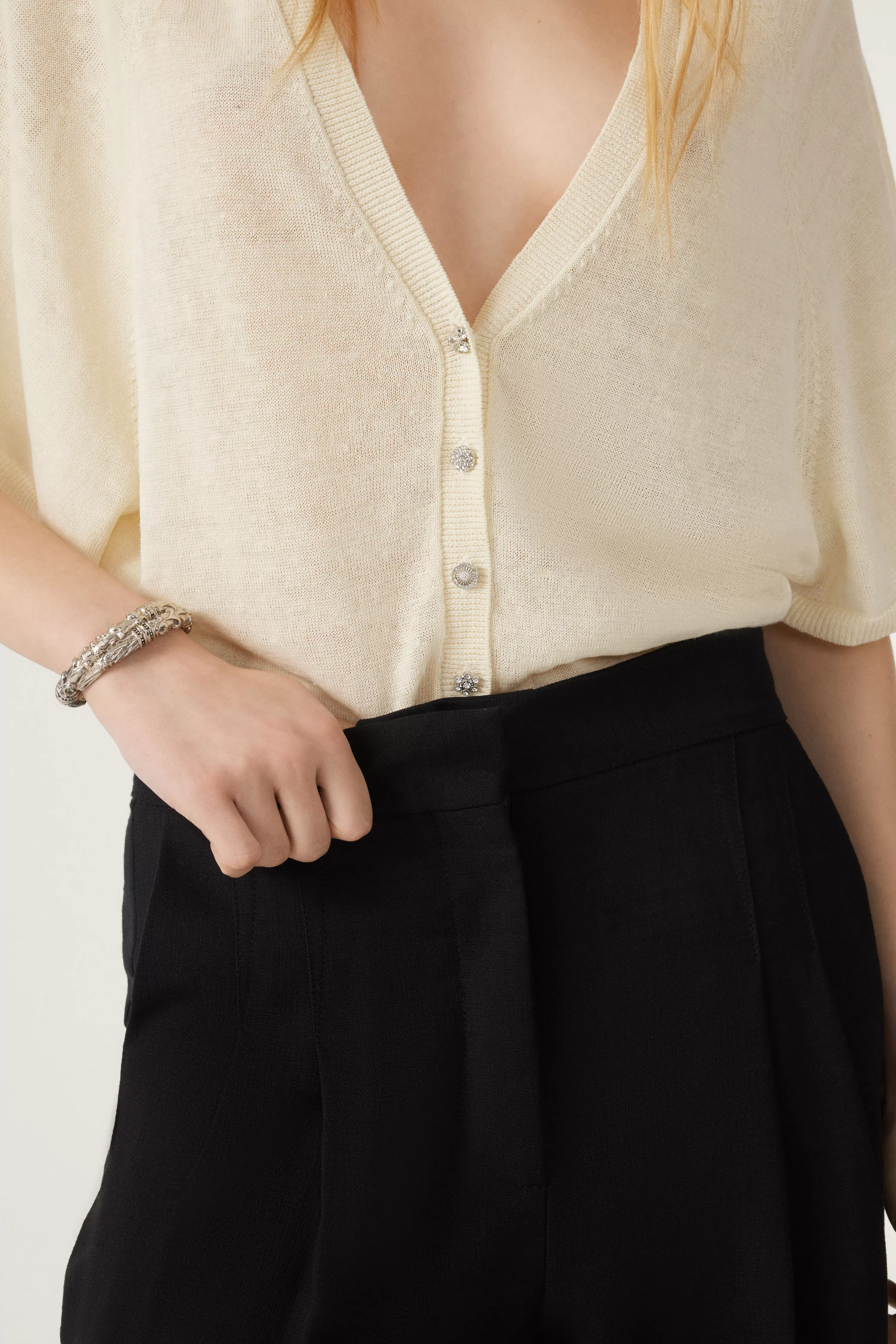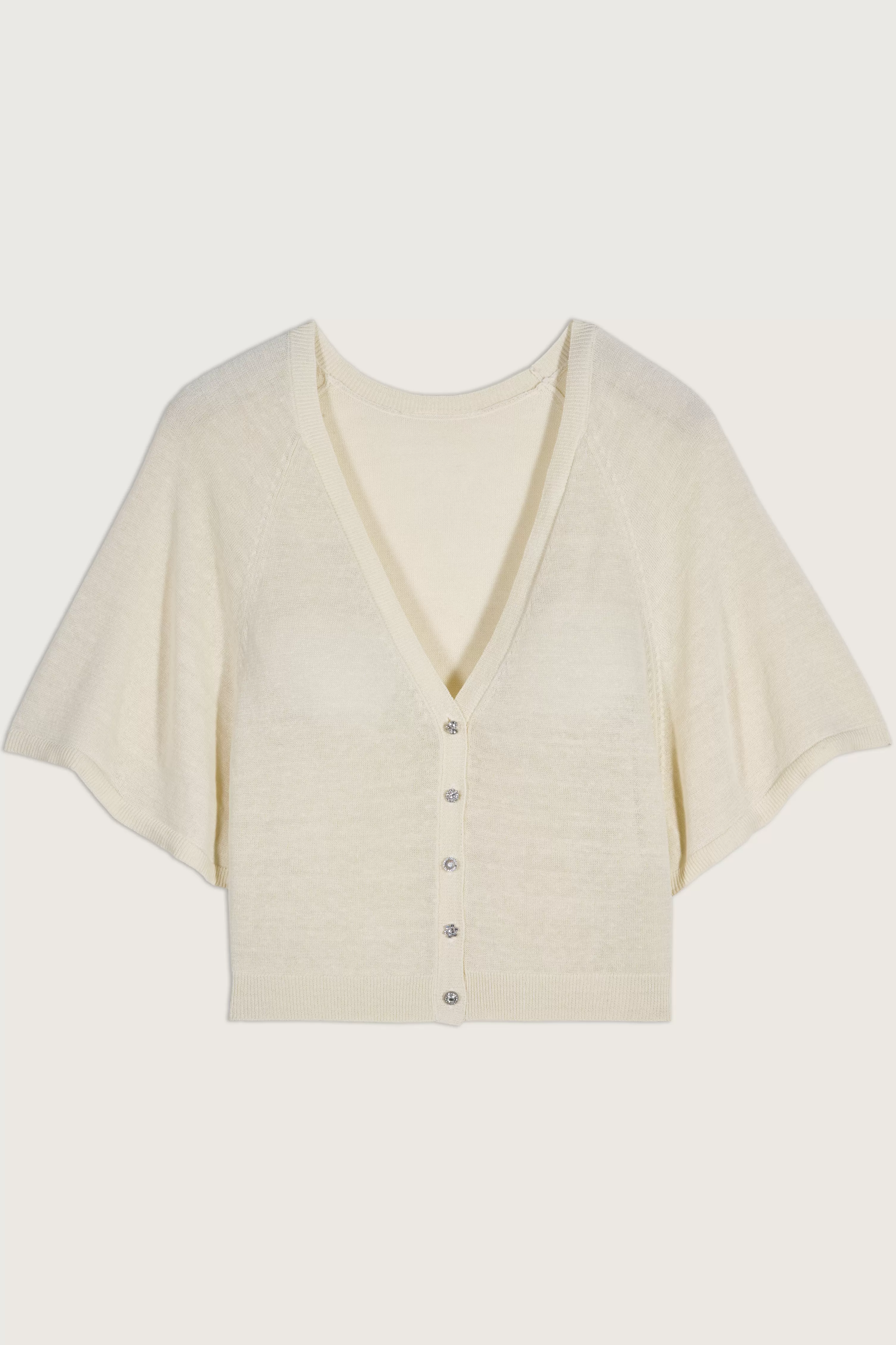 De Domino-Trui Is Zowel Elegant Als Gemakkelijk Om Mee Te Leven. Dit Korte V-Vest Heeft Een Wijde Snit, Vleermuisarmsgaten Die Zijn Geaccentueerd Met Pointellewerk, Korte Mouwen En Ribboorden In De Taille, Onderaan De Mouwen En Op Het Knoopsgat. Het Zeer Flexibele Materiaal Op Linnenbasis Geeft Het Finesse En Lichtheid. Het Verwarmt Een Kille Zomeravond Of Kan Direct Op De Huid Gedragen Worden Met Een Wijde Broek.
