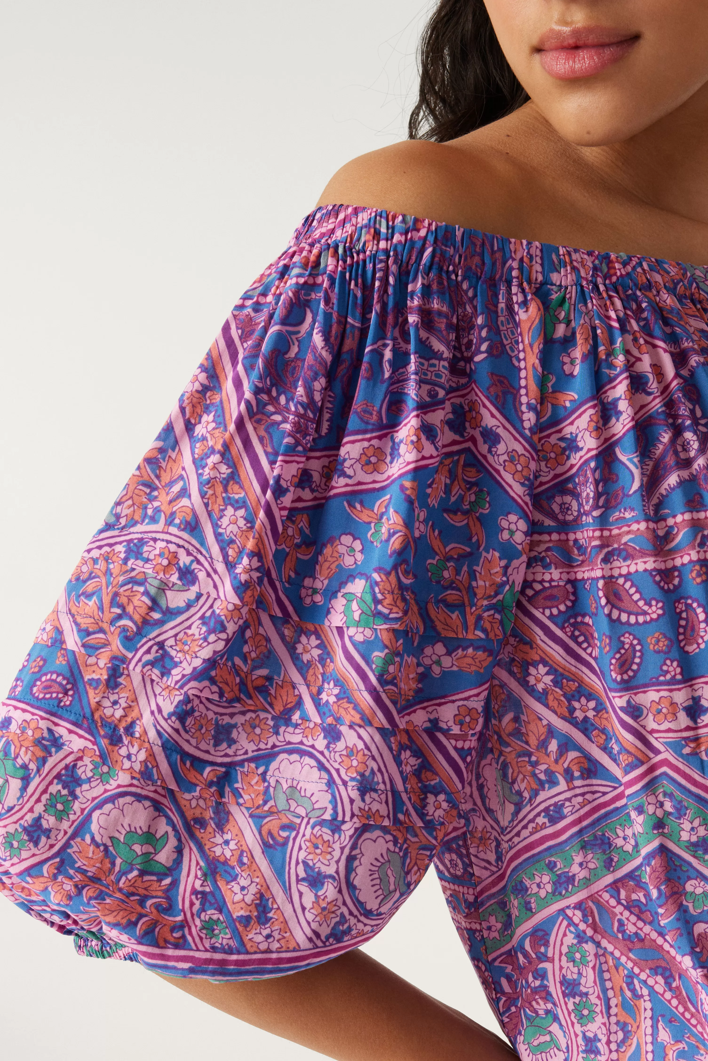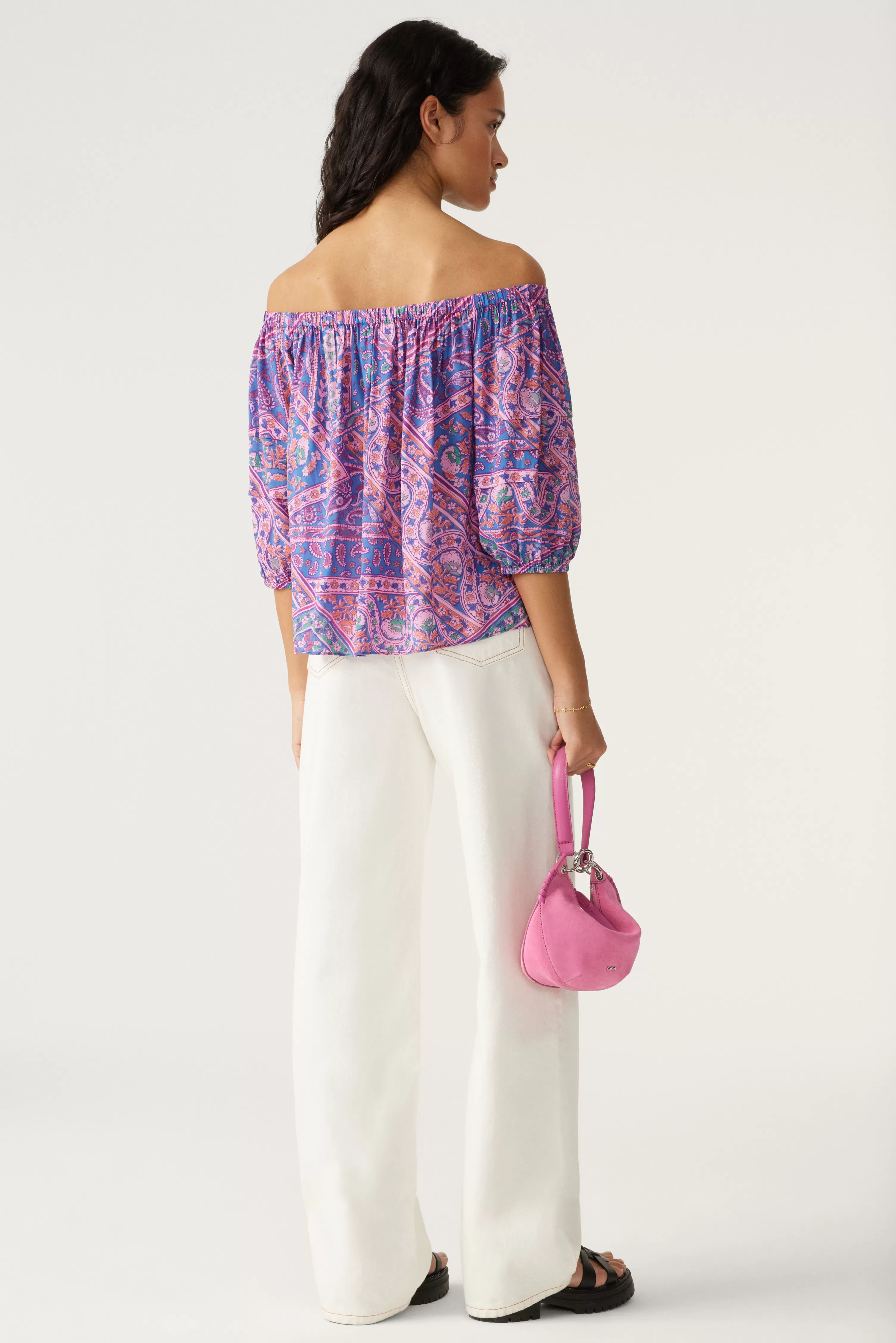 De Top Fenji Is Een Fris, Elegant En Zeer Vrouwelijk Model. De Snit Is Vrij Los En Daarom Zeer Comfortabel. De Mouwen Zijn In Ballonstijl Met Een Elastisch Uiteinde Om Het Stuk Volume Te Geven. De Stof Is Vloeibaar, Het Is Als Een Streling Op De Huid En Het Begeleidt Je Bewegingen Zonder Ze Te Belemmeren. We Houden Van De Halslijn, Die De Schouders Ontbloot En Het Een Onweerlegbaar Glamoureuze Kant Geeft. Combineer Met Een Zwarte Pantalon Voor Een Ultra Chique Look.