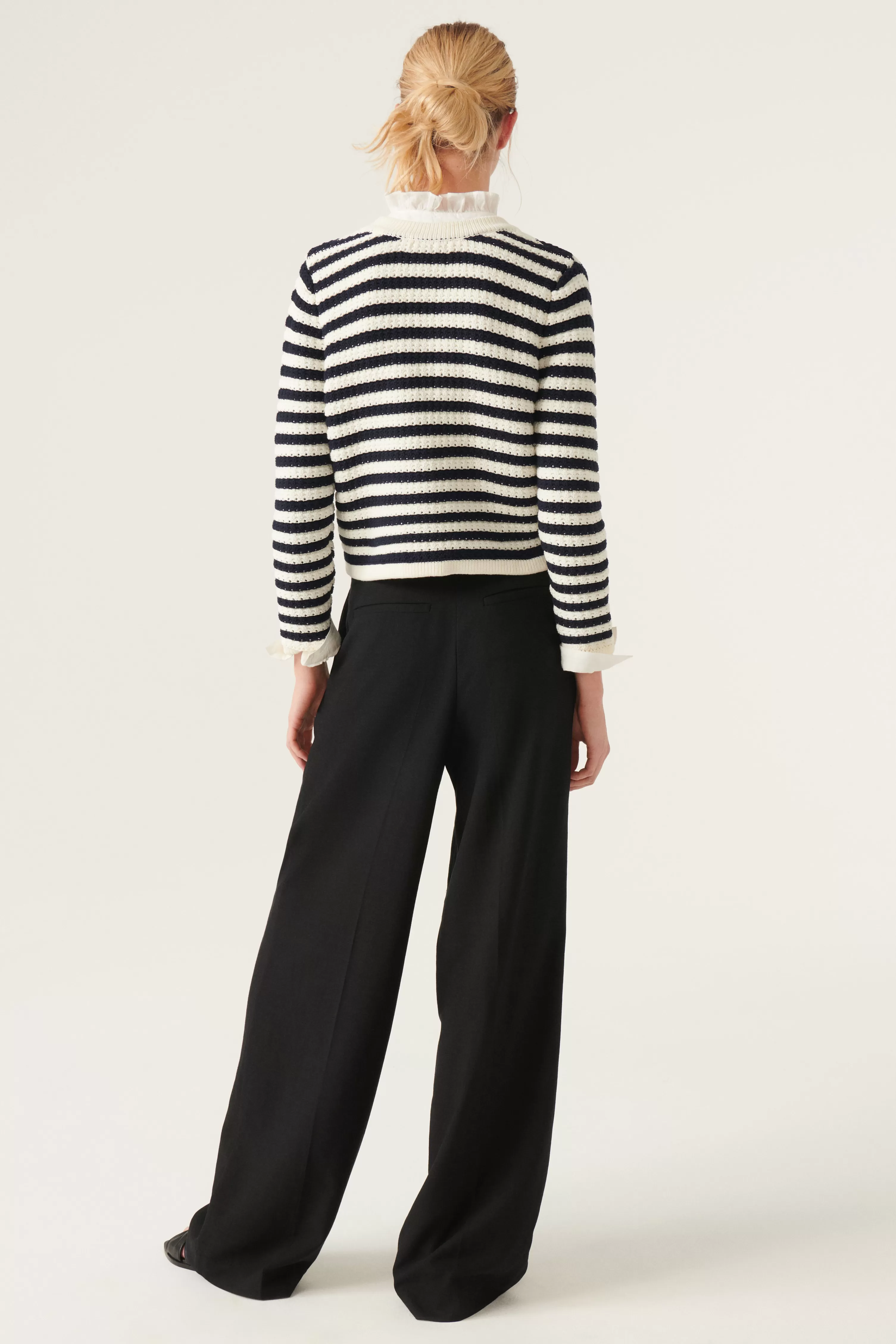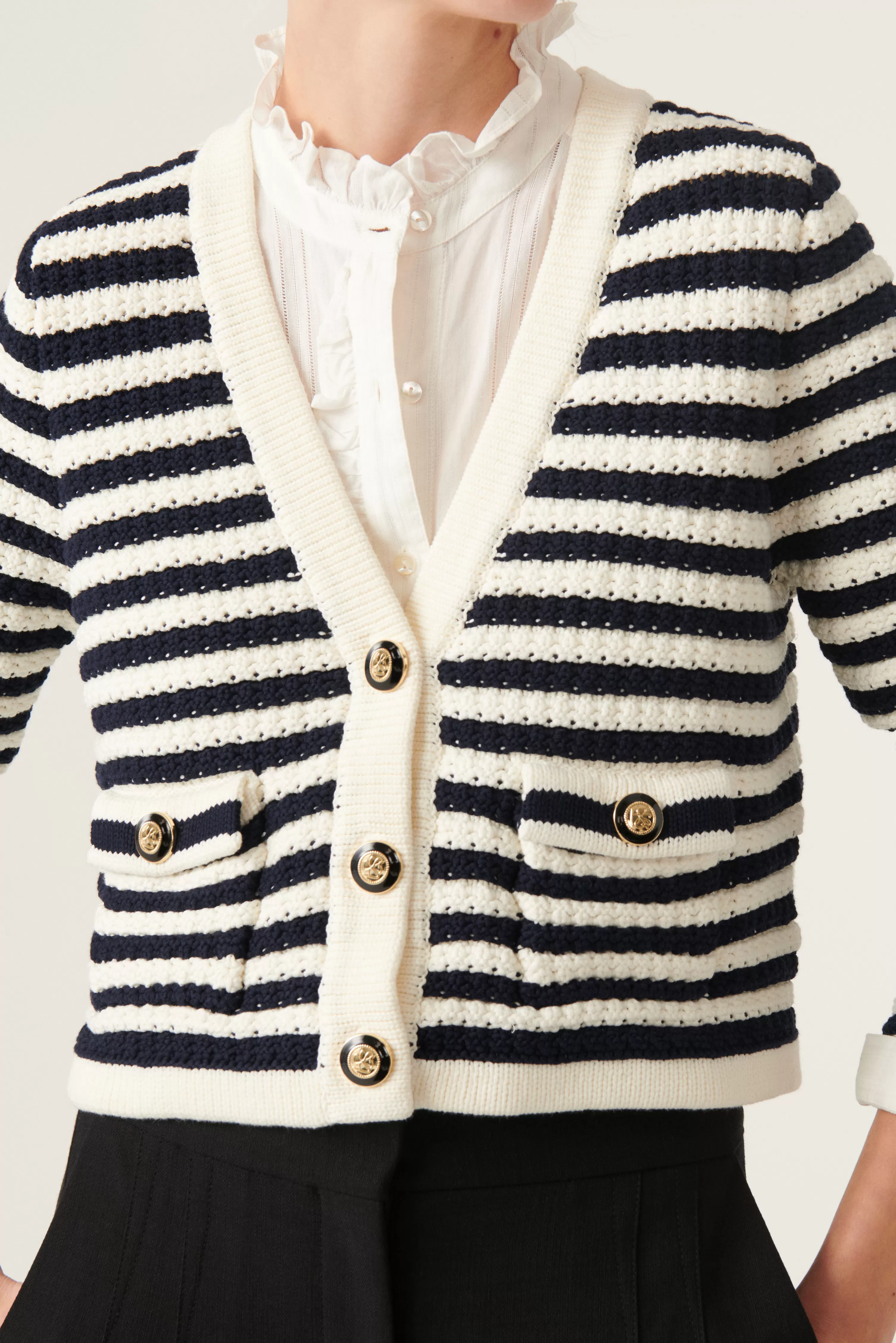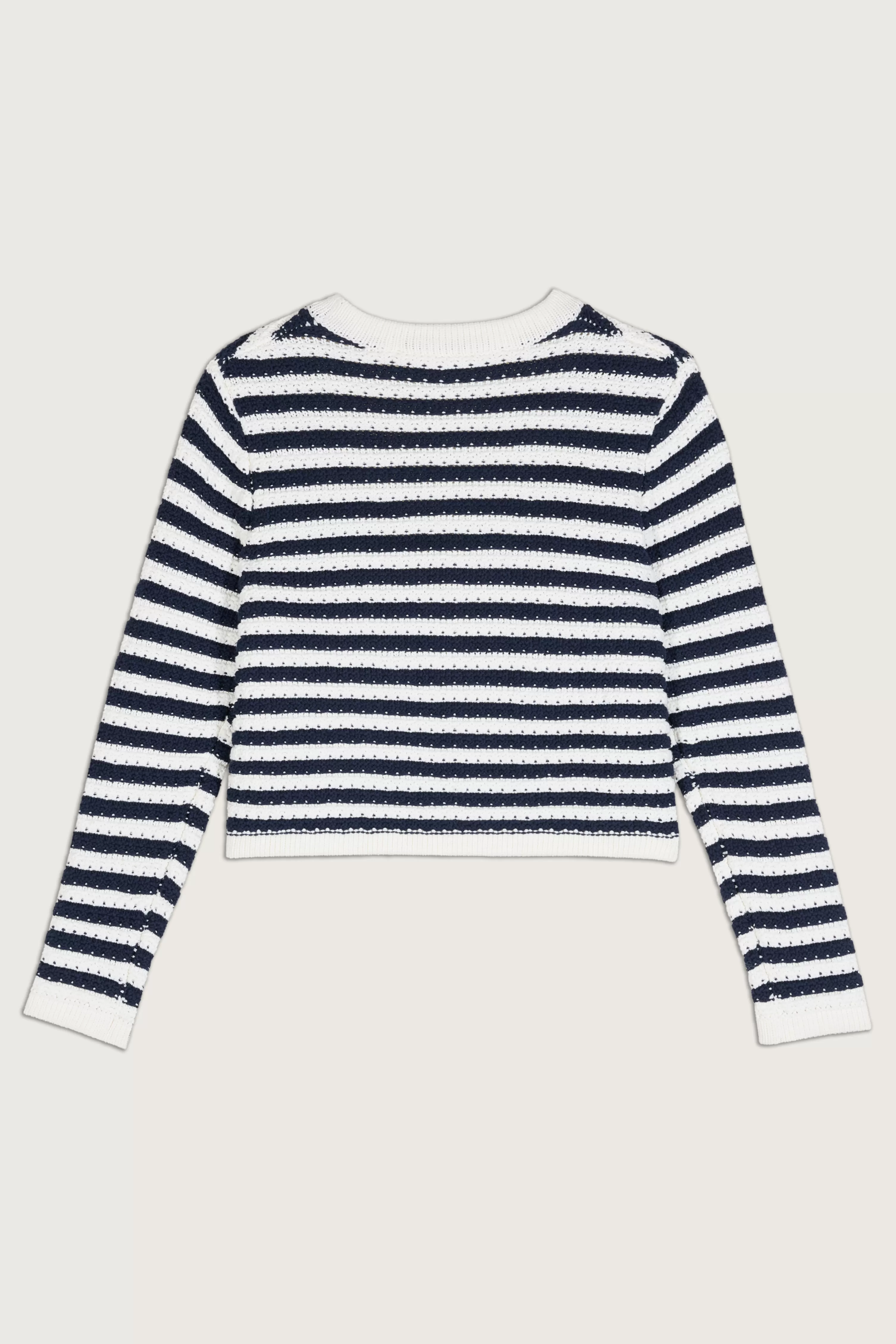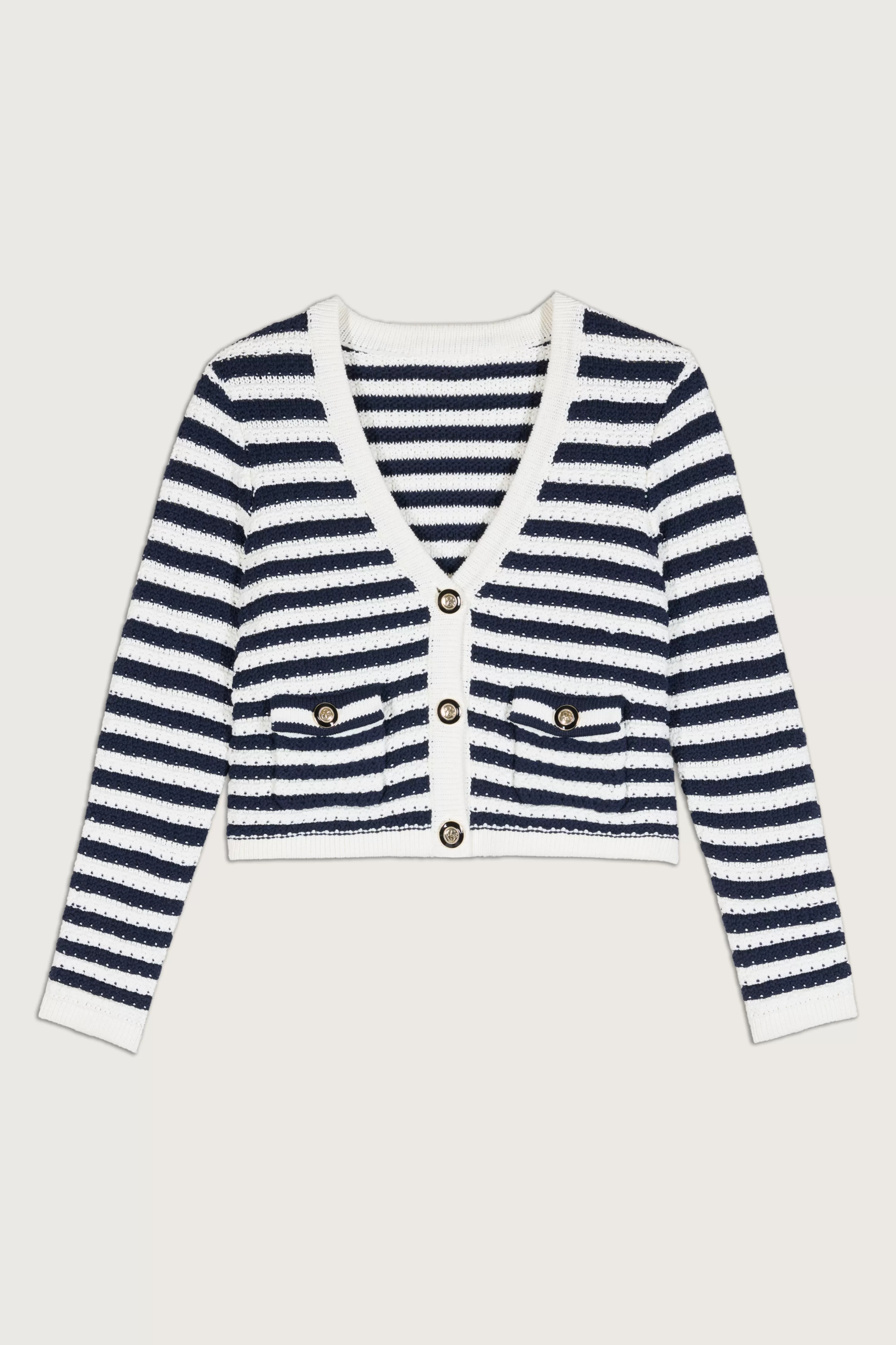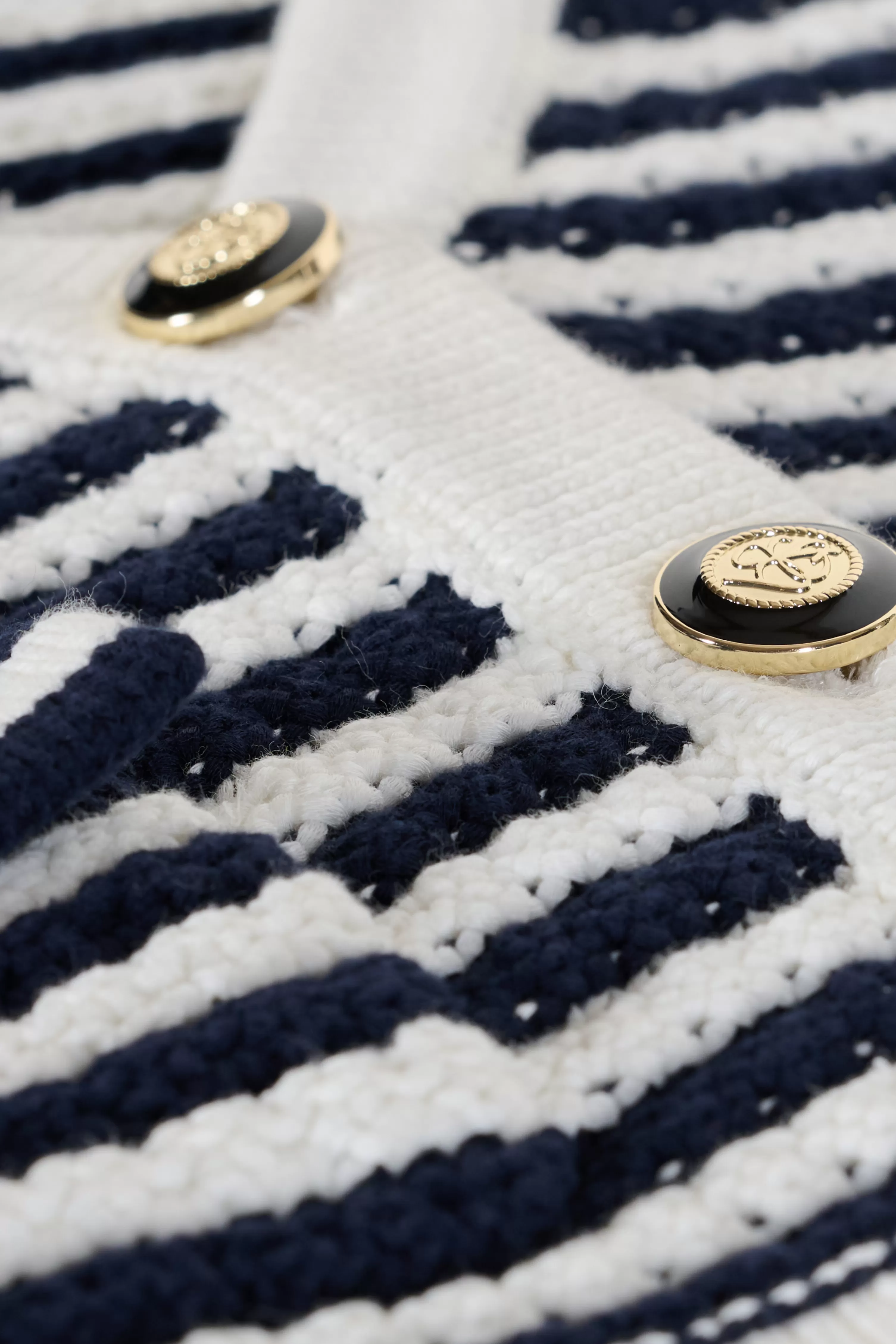 Het Gamden Vest Is Een Absoluut Subliem Gebreid Cropped Model. Het Neemt De Codes Over Van De Marinieres Waar We Zo Van Houden. Ecrukleurige En Blauwe Strepen En Gouden Knopen In Militaire Stijl Die Het Licht Vangen. Het Gebruikte Garen Is Grotendeels Katoen, Dus De Top Is Resistent En Zeer Comfortabel, Een Waar Genot Om Te Dragen. We Houden Van De Verhoogde En Getextureerde Steek Die Gebruikt Is Om Het Te Maken, Het Geeft Het Karakter En Originaliteit. Te Combineren Met Een Korte Short Of Een Getailleerde Broek!