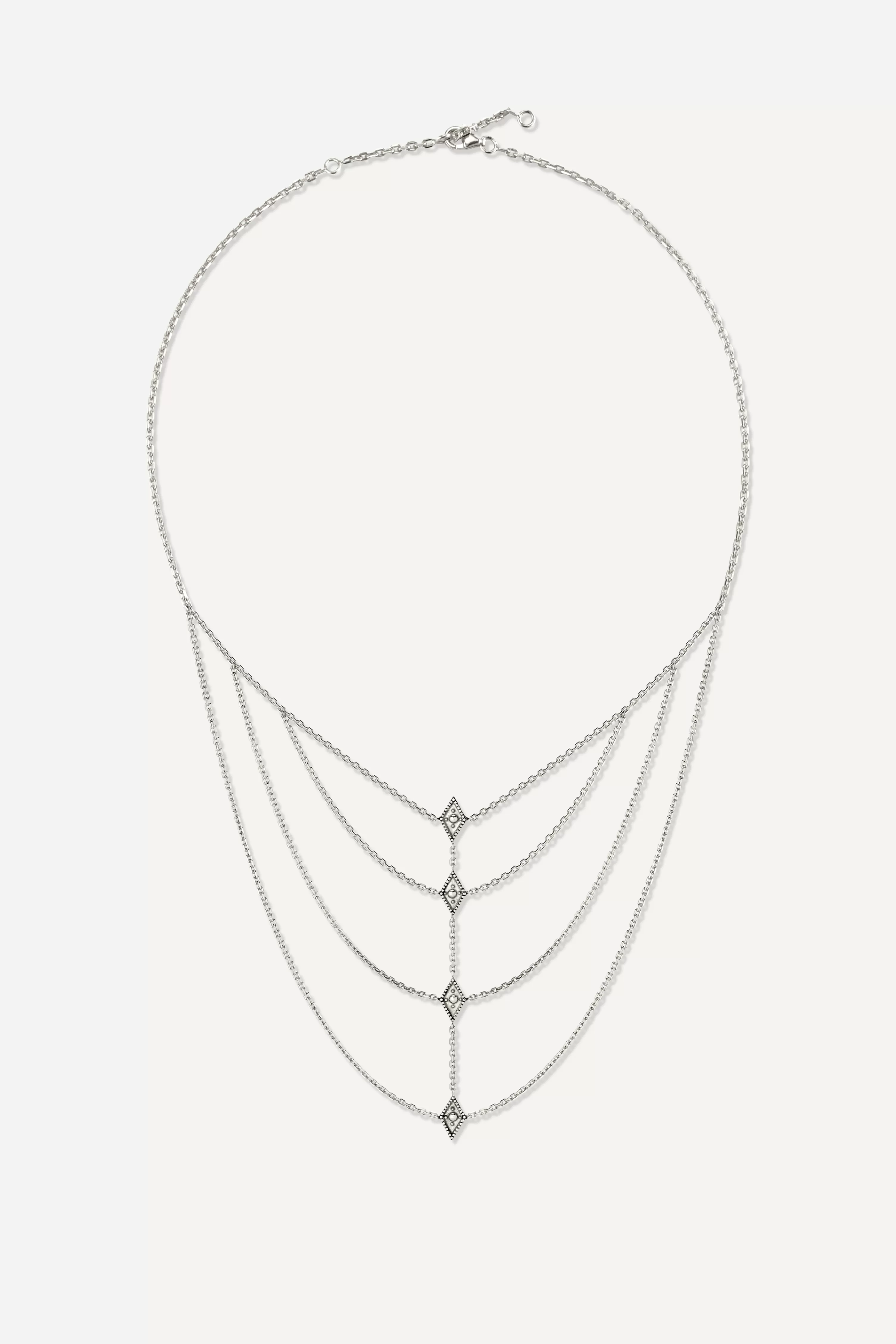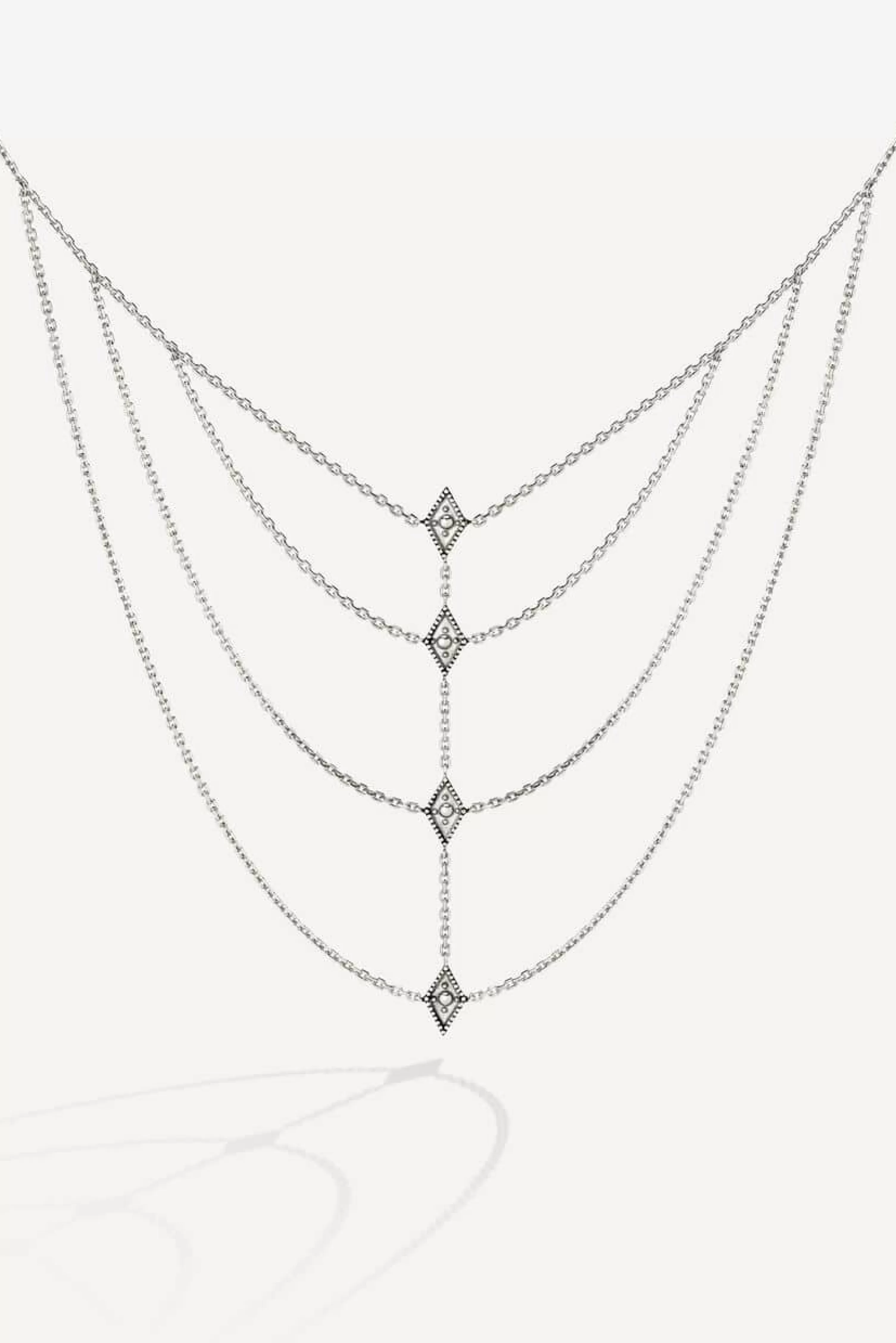-Harmonie En Lichtheid Zijn De Woorden Die De Gypset-Halsketting Het Beste Omschrijven. Het Speelt Met De Charme Van Zijn Schattige Ontwerp Op Basis Van Gelaagdheid En Siert Ons Decollete Met Verfijning. Samengesteld Uit Vier Kettingen Van Verschillende Lengtes Die Bij Elkaar Worden Gehouden Door Delicate Gebeitelde Diamanten, Voldoet Dit Zilveren Juweel Aan Al Onze Verlangens. Combineer Het Met Een Top Met Een Open Halslijn Of Een Effen Of Gebloemde Jurk: Het Zal Je Look Betoveren Op Kantoor Of ‘S Avonds Met Vrienden.