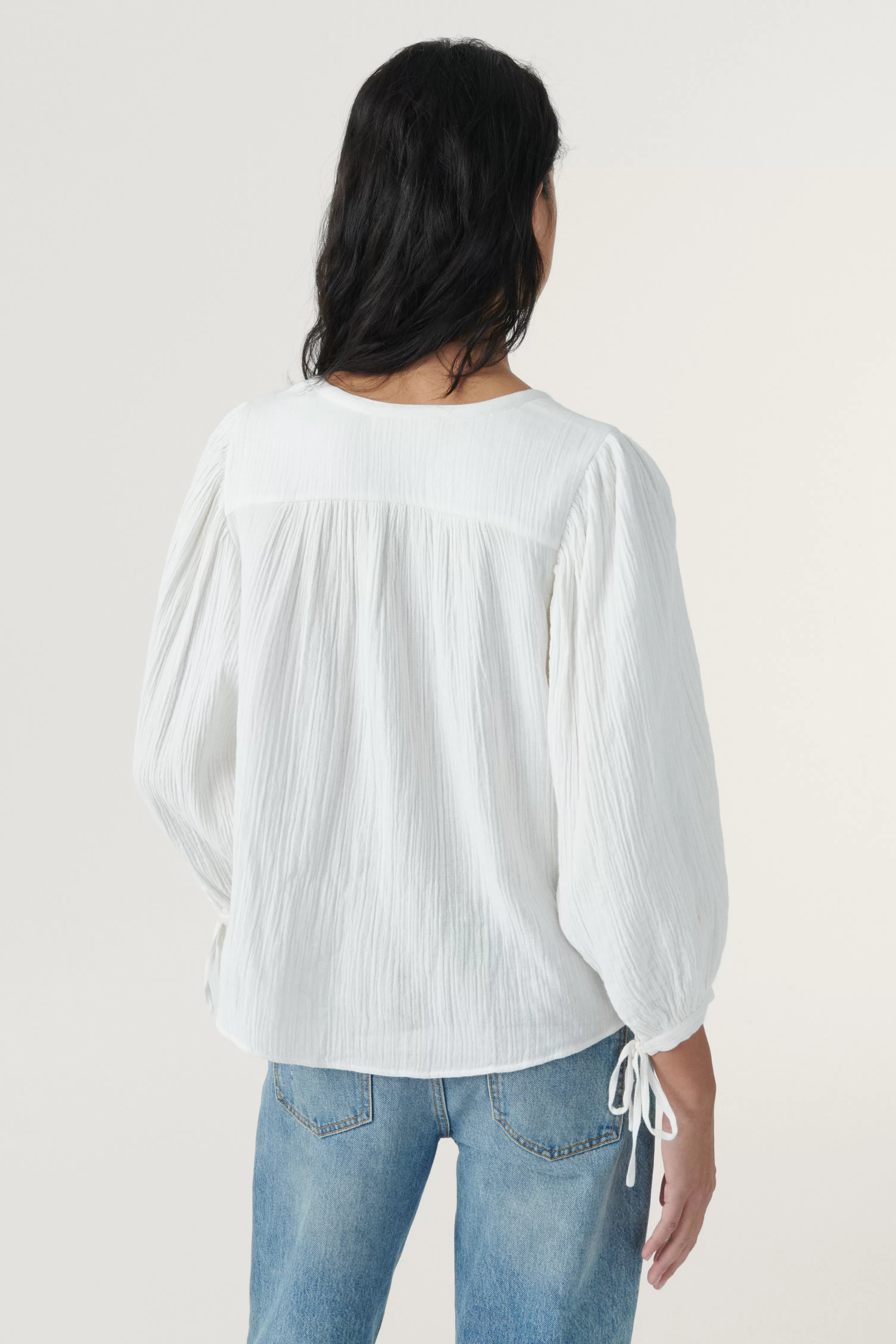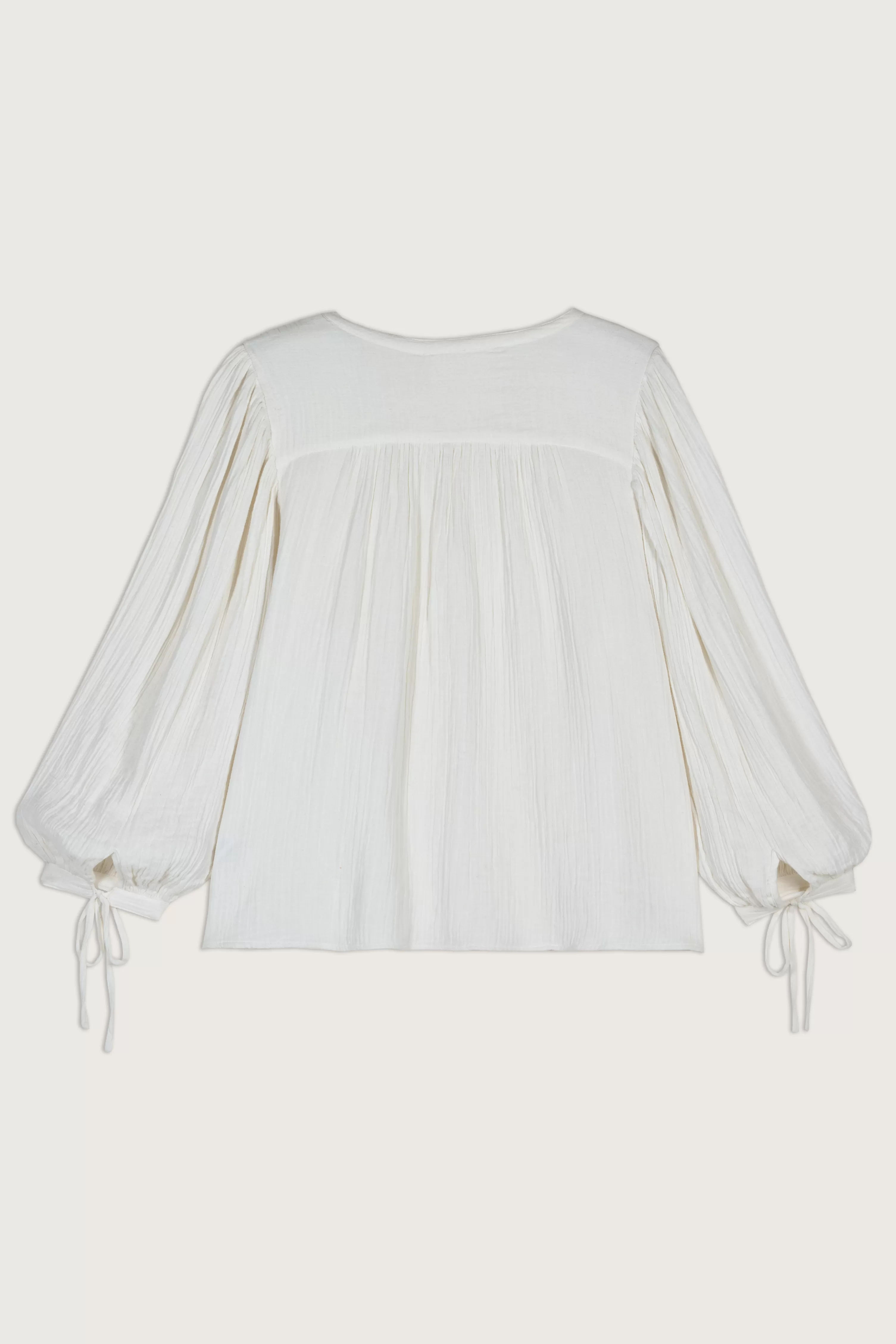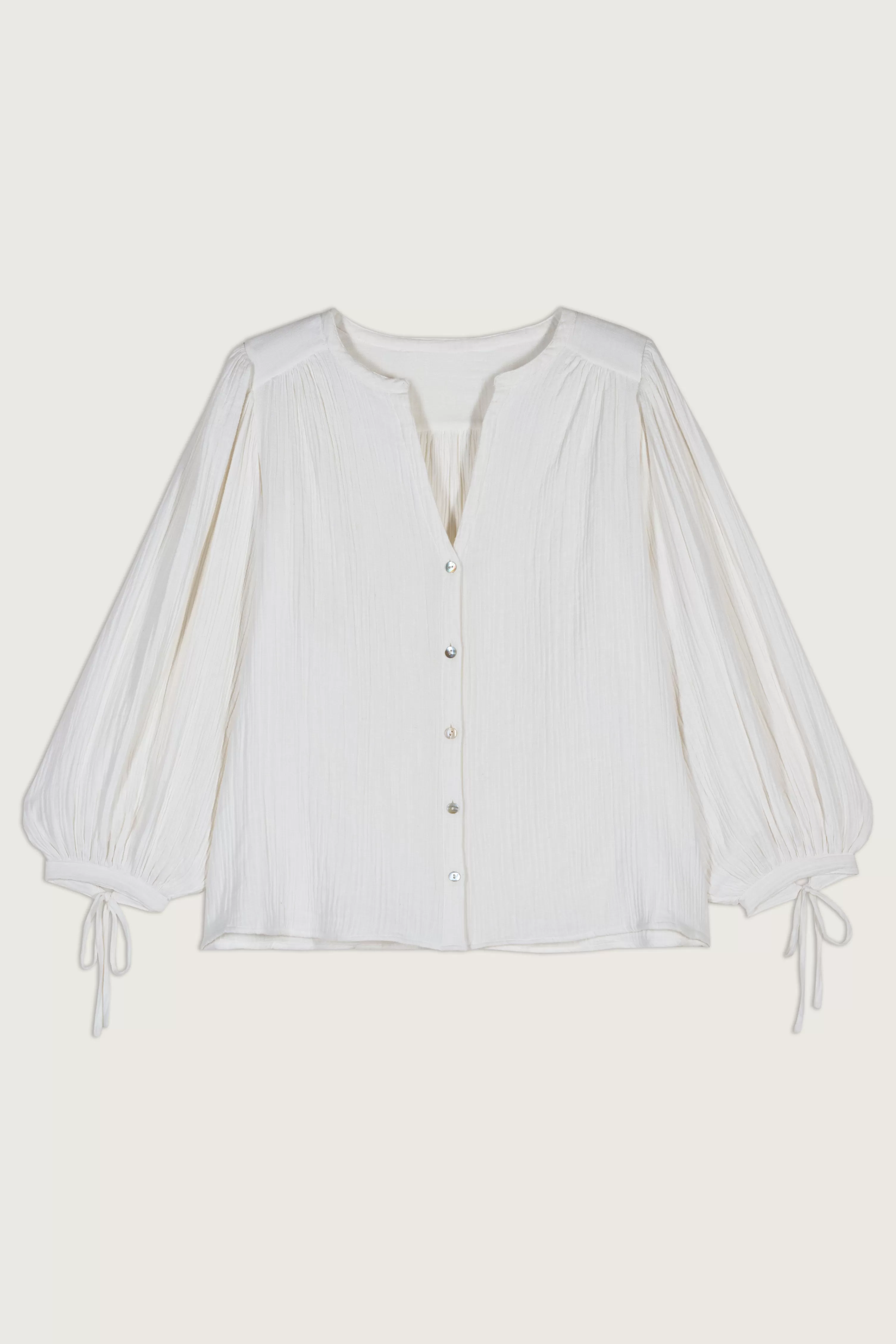Het Kida-Shirt Is Vrouwelijk En Elegant. Deze Katoenen Blouse Biedt Een Wijd Volume, Lange Mouwen Vol Gemak Die Bij De Polsen Worden Aangetrokken Door Strikken Voor Een Romantische Touch. De V-Hals Gaat Verder Met Een Knoopsluiting Verfraaid Met Parelmoeren Knopen. Het Extra Detail? De Uitsparing Bij De Schouders Die Is Gekleed In Plooien Zorgt Voor Een Mooie Structuur. Een Easy-Going Shirt, Om In Je Favoriete Jeans Te Glijden.
