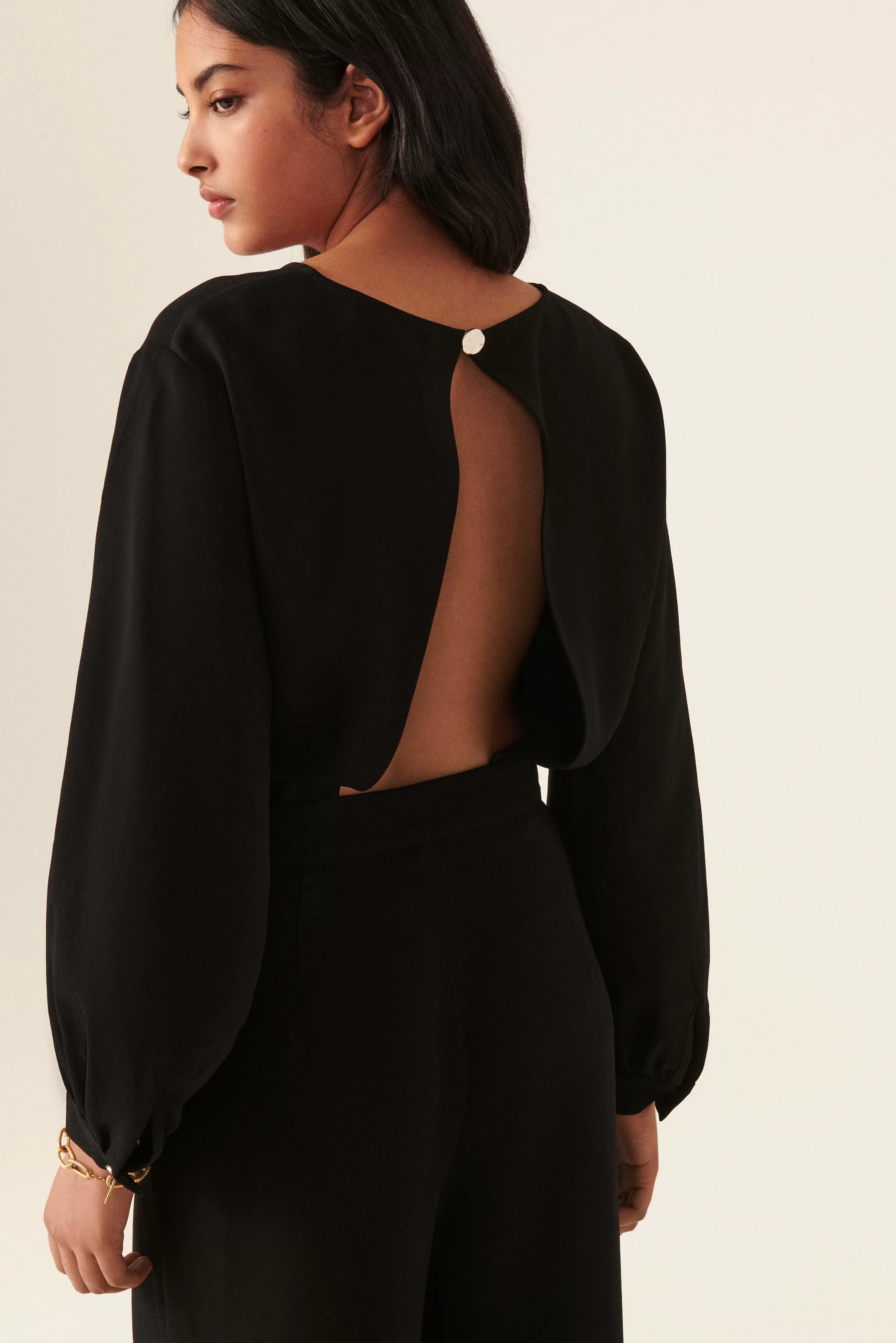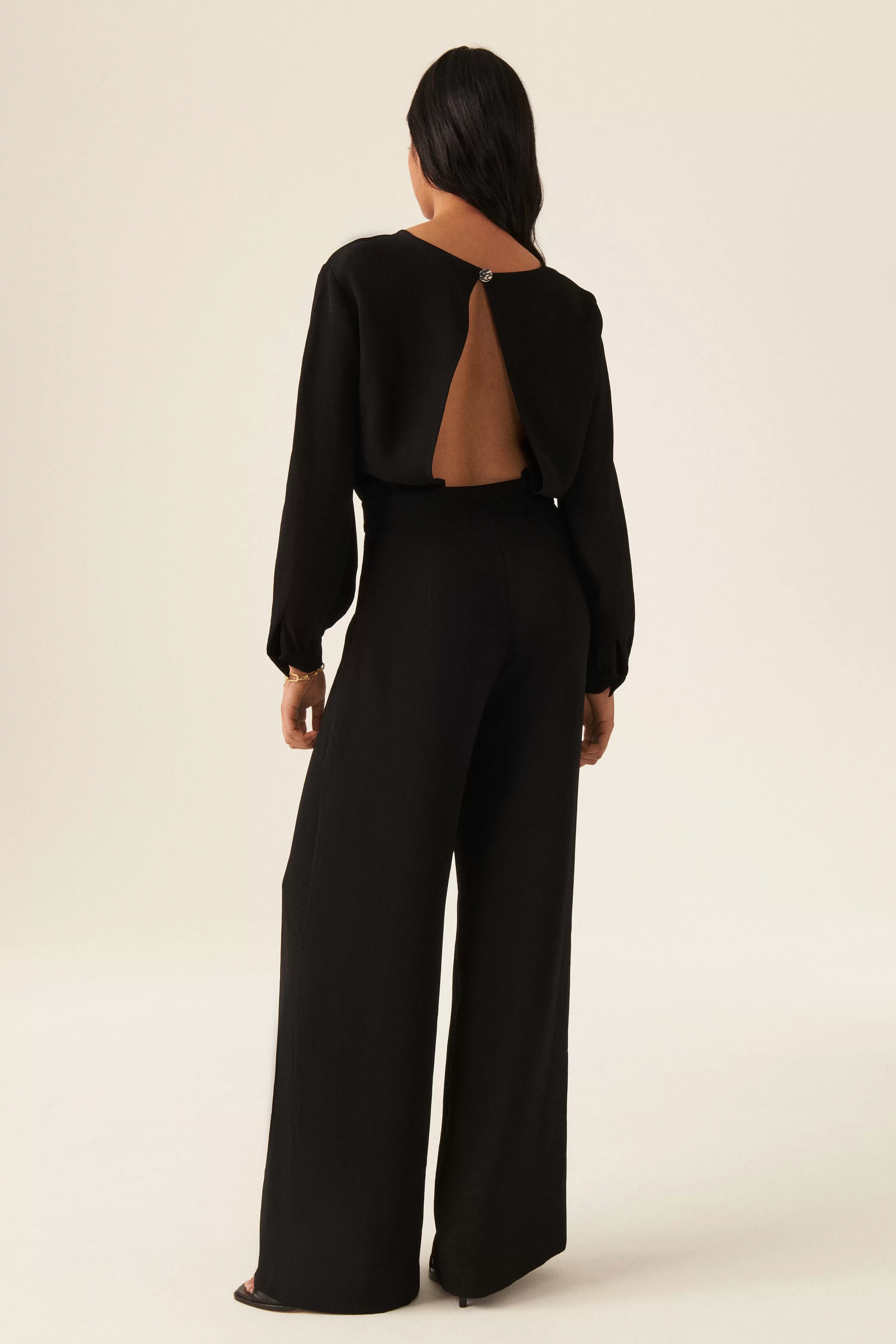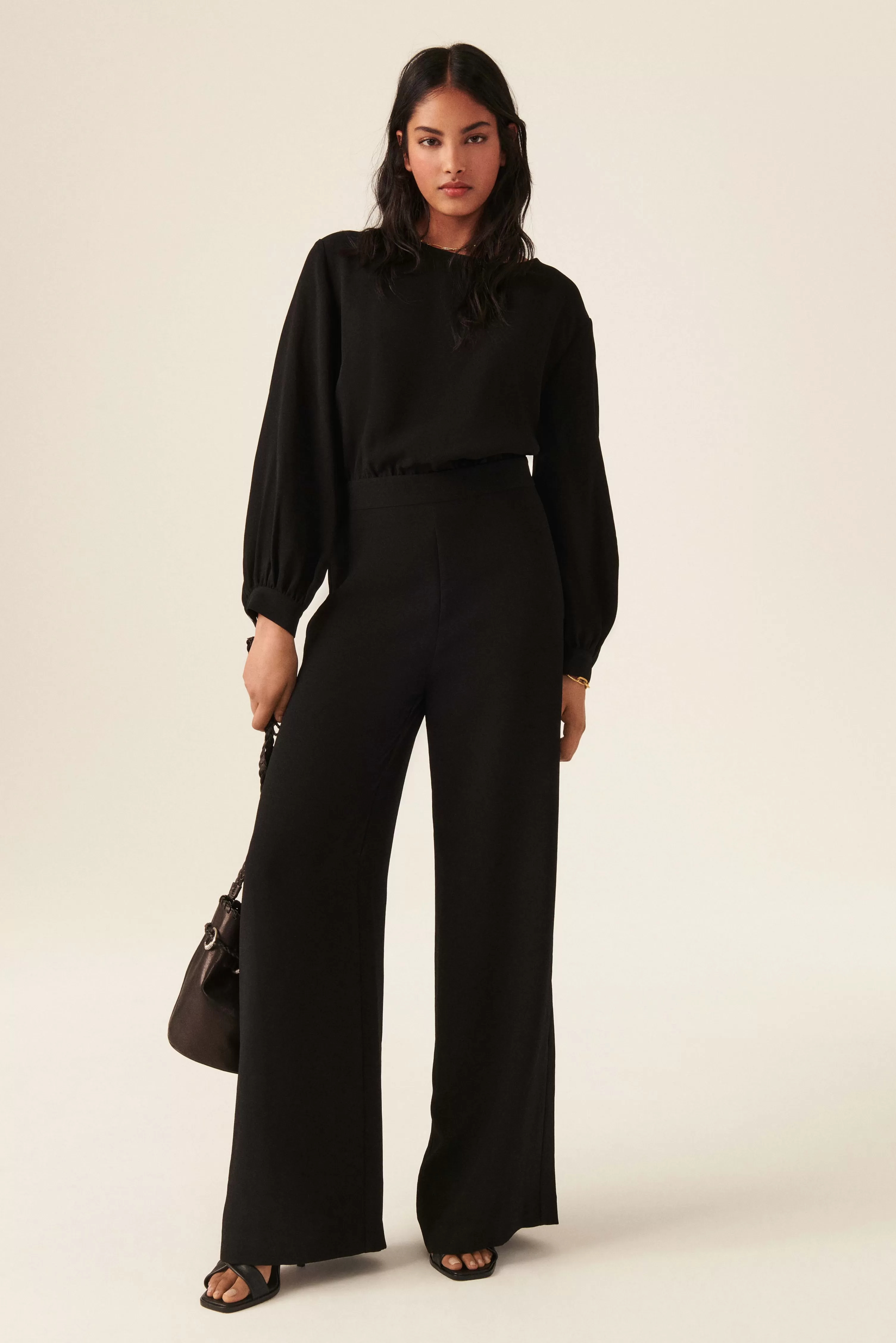 De Jumpsuit Obby Is Zowel Elegant Als Ultravrouwelijk. Het Heeft Een Onberispelijk Silhouet Met Een Ronde Hals, Iets Verlaagde Armsgaten, Wijde Lange Mouwen Die Strak Om De Polsen Zitten, Een Opvallende Hoge Taille En Wijde Pijpen. De Vloeibaarheid Geeft Het Een Prachtige Herfst. Ze Creeerde De Verrassing Door Een Prachtige Blote Rug Te Ontdekken In Een Omgekeerde V Waar We Van Houden! Let Op Het Elegante Detail Van De Juweelknopen Die De Mouwen En De Kraag Sluiten. Combineer ‘M Met Sneakers Voor Een Casual Look Of ‘S Avonds Met Pumps.