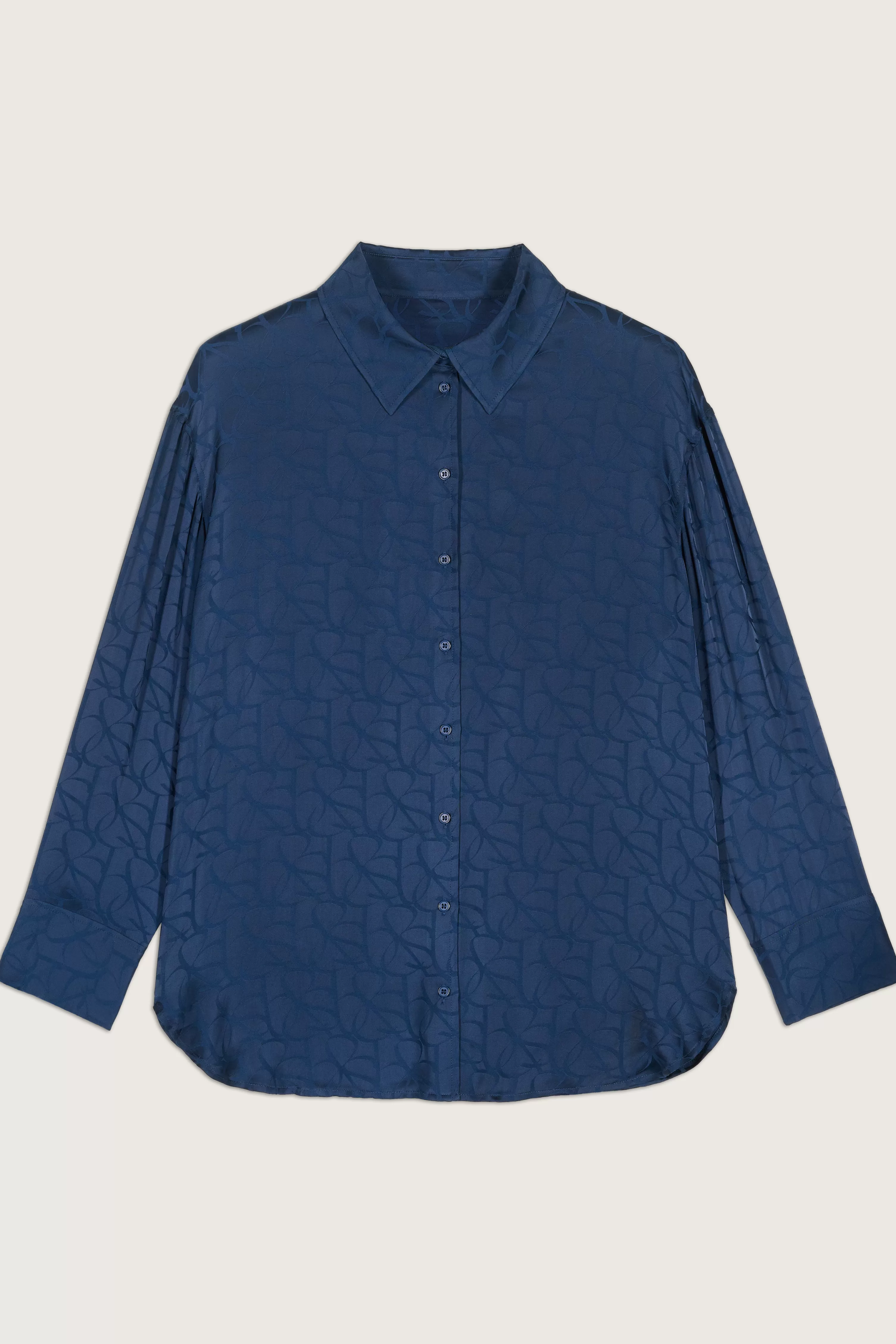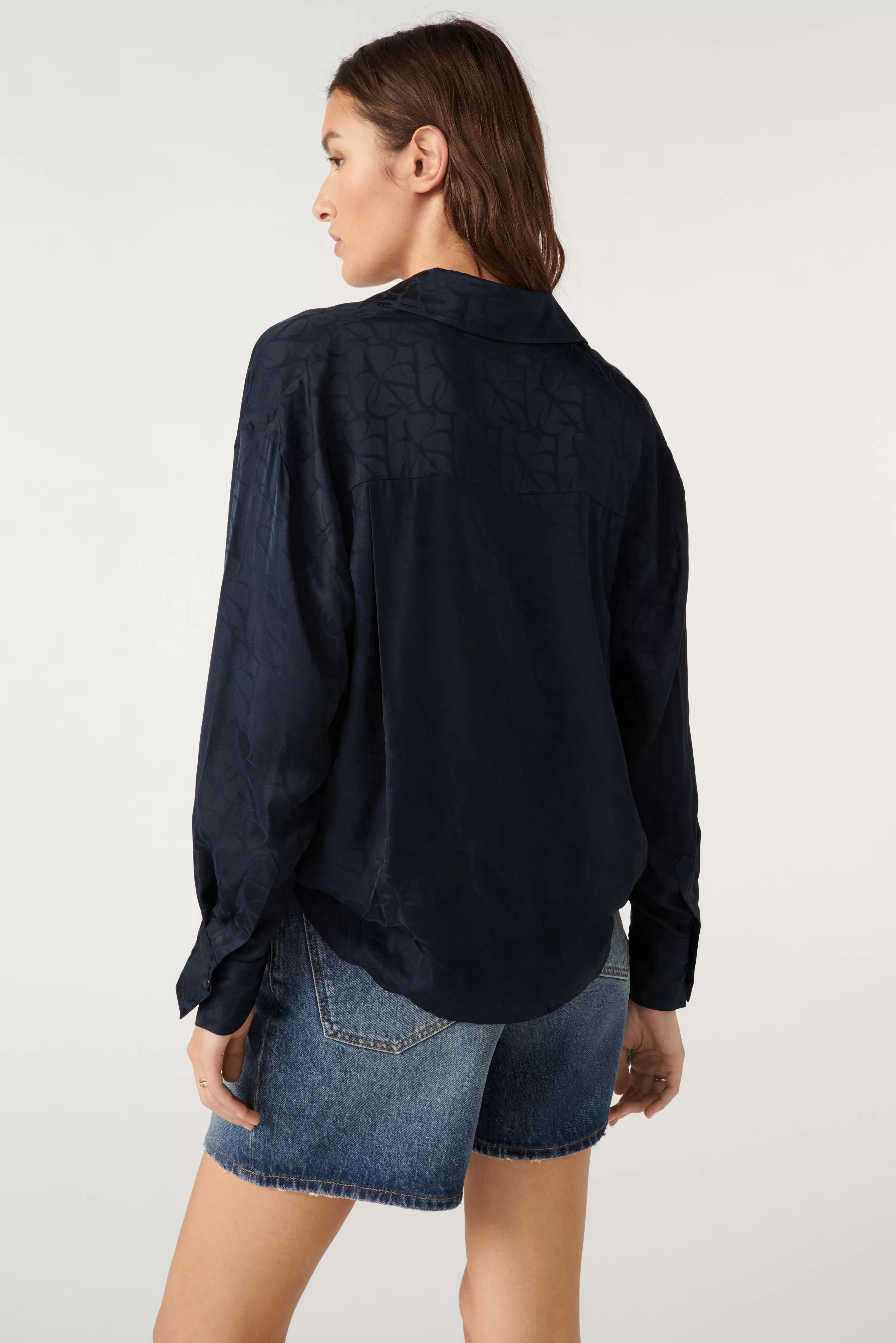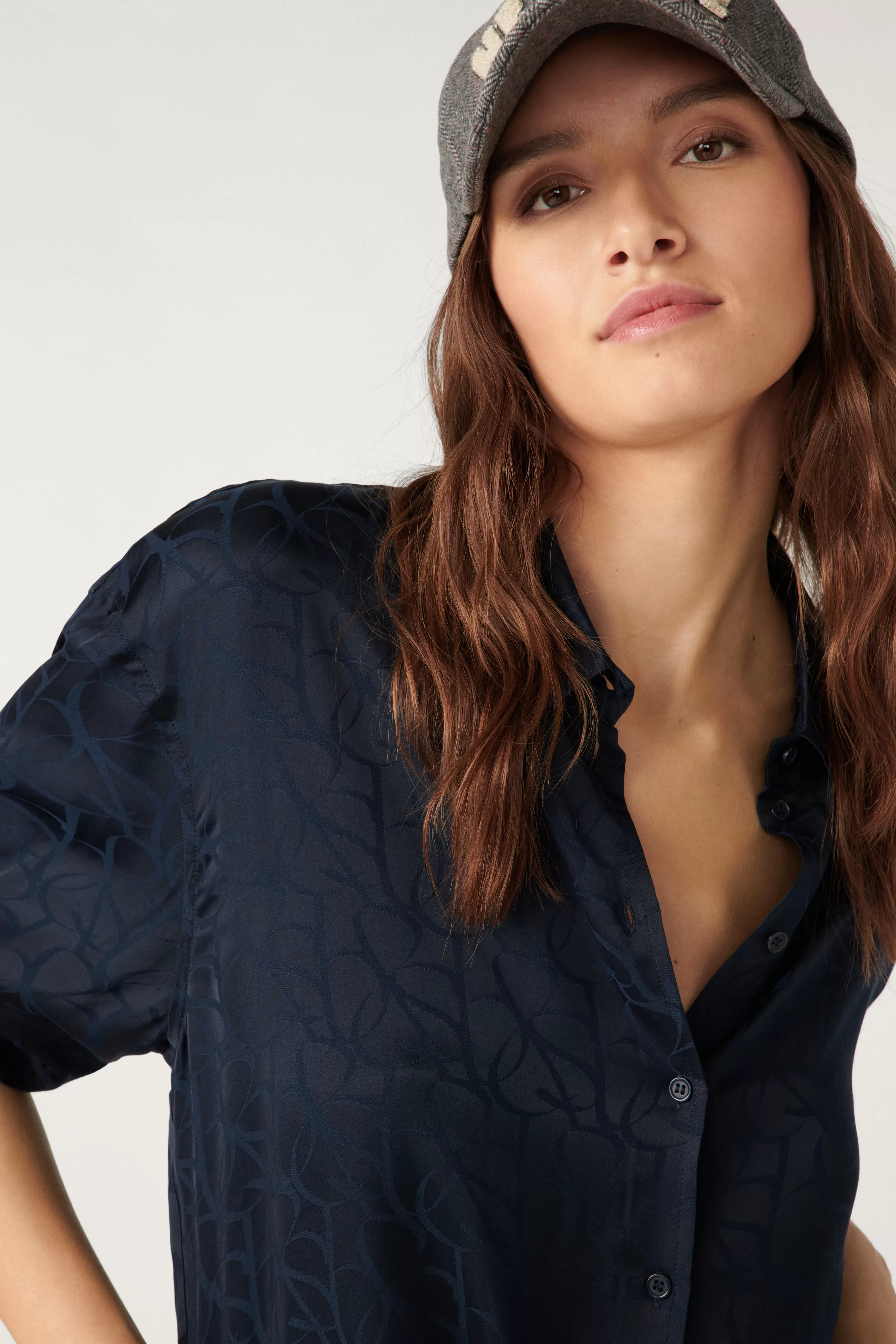 Het Modune-Shirt Is Een Wonder Waar Je Niet Meer Zonder Kunt. Ultravloeiend, In Jacquard Viscose En Geeft Elke Beweging Nog Meer Gratie. Lange Mouwen, Overhemdkraag, Sluit Aan De Voorzijde Met Een Rij Knopen. Overmaats, Het Is Heel Gemakkelijk Te Associeren En Kan Binnen Enkele Seconden Van Stijl Veranderen. We Houden Van Zijn Monogram, Zo Elegant. Combineer Met De Bijpassende Soepel Vallende Broek Voor Een Chique Pyjama-Look Voor Overdag!